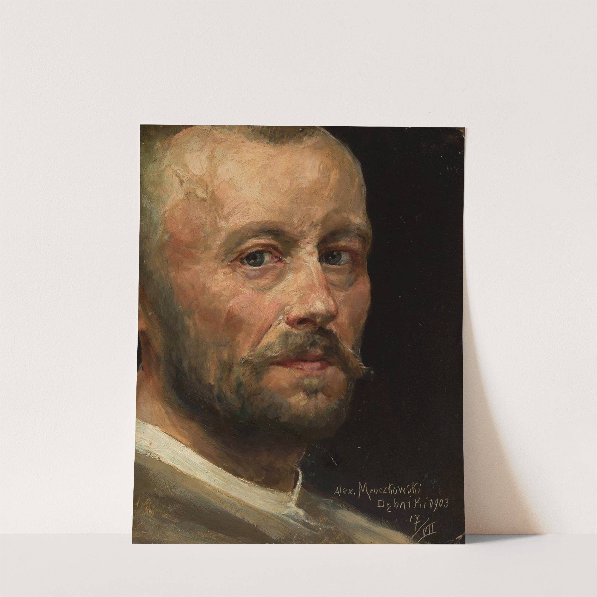 This striking self-portrait by Aleksander Mroczkowski captures the realistic yet expressive essence of a middle-aged man with a contemplative gaze. The artist employs a rich palette of warm tones, including browns, tans, and subtle reds, to bring life to the...