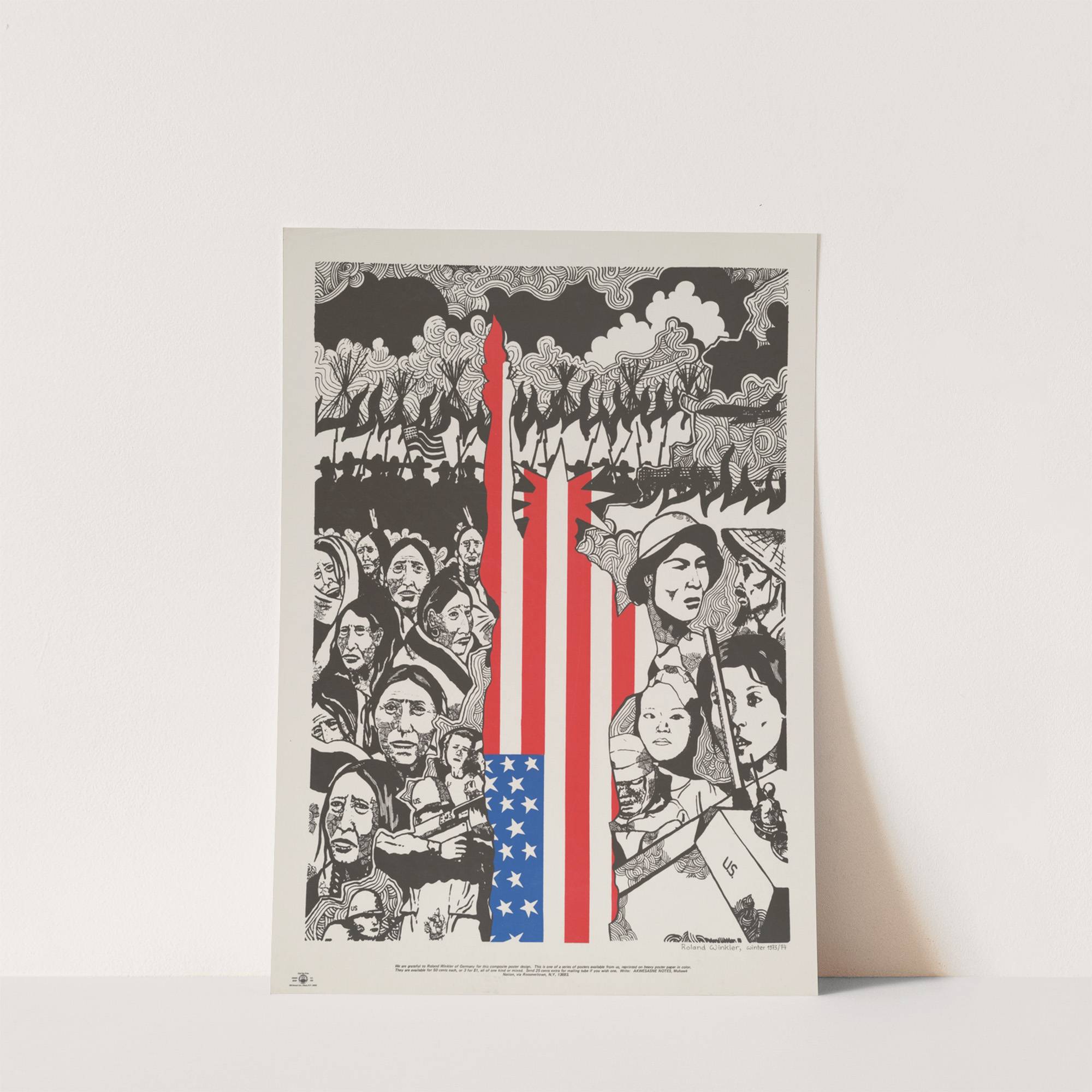 Poster showing composite drawing juxtaposing North American Indians with Vietnamese, with flag in shape of Statue of Liberty superimposed by Roland Winkler - Wall Art Print