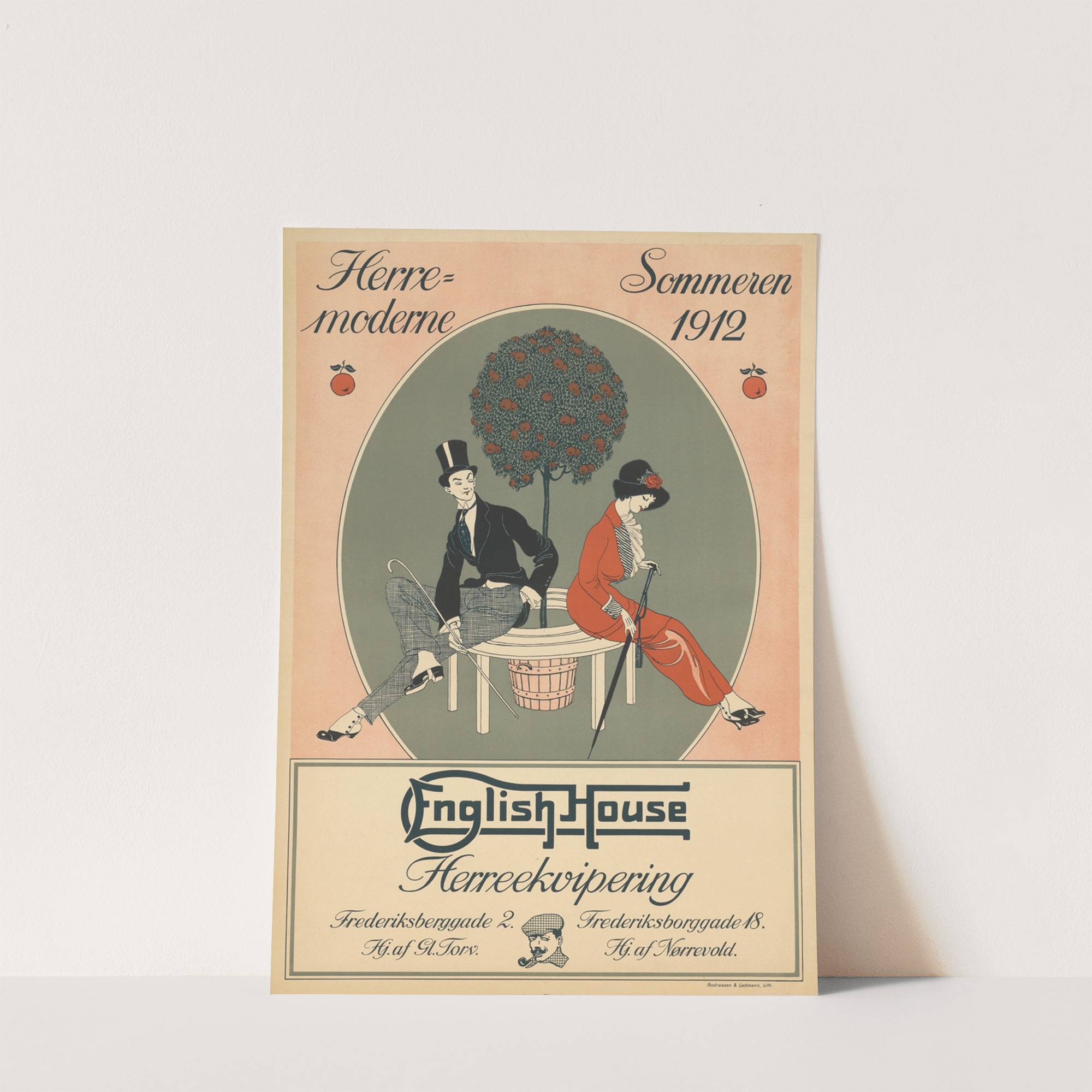 This vintage-style art print features two elegantly dressed individuals seated against a softly colored background. The left figure is a gentleman in a black formal suit with grey checkered trousers, a tall top hat, and polished black shoes. He rests...
