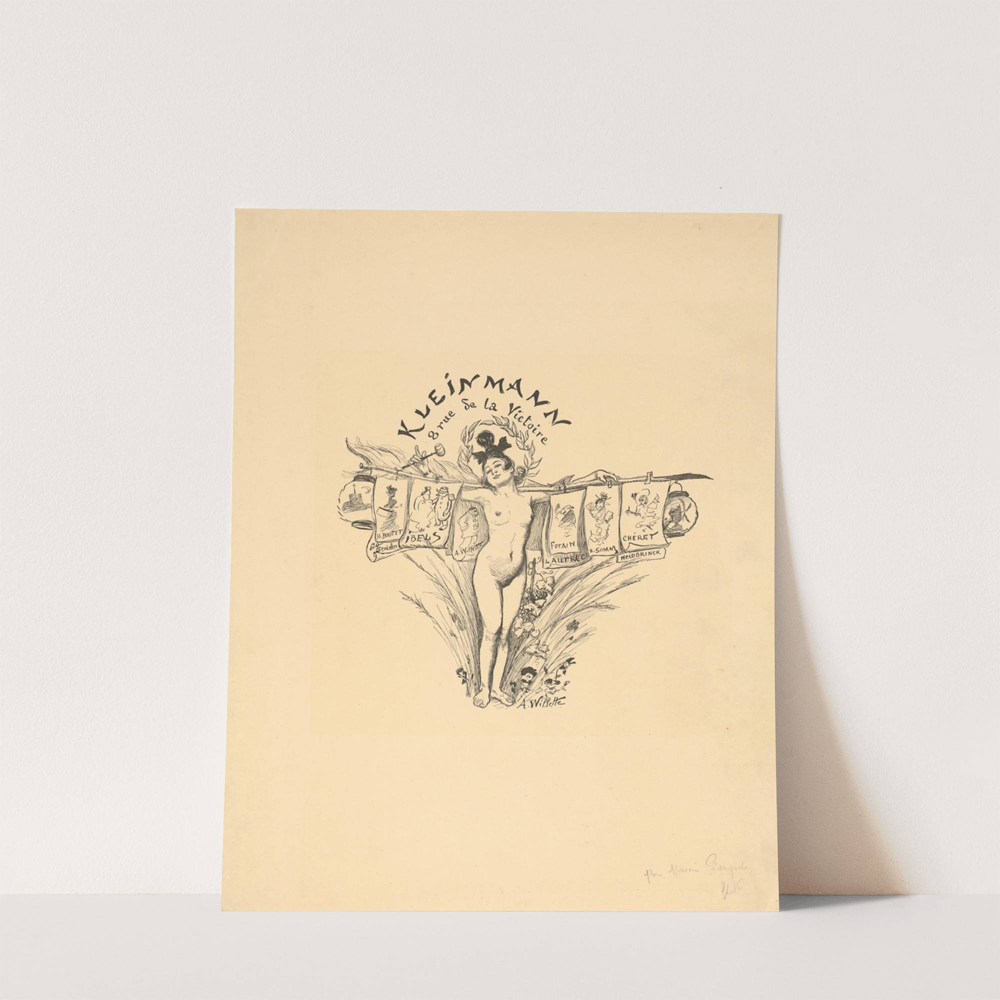 This striking monochromatic art print, "Kleinmann 8 rue de la Victoire" by Adolphe Léon Willette, showcases a delicate yet provocative scene. At the center of the composition is a nude female figure with a slender build and soft curves, her...