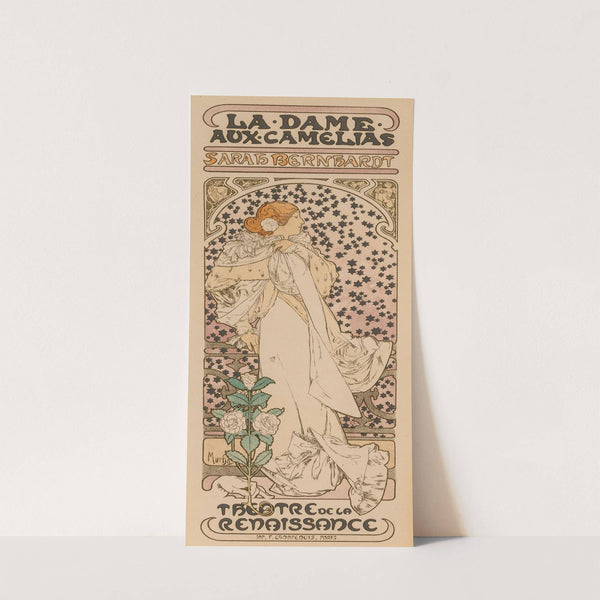This elegant art print features "La Dame aux Camélias" by Alphonse Mucha, part of his iconic series from the Masters of the Posters. The artwork showcases a beautifully drawn woman with delicate, flowing red hair standing gracefully amidst blooming camellias....