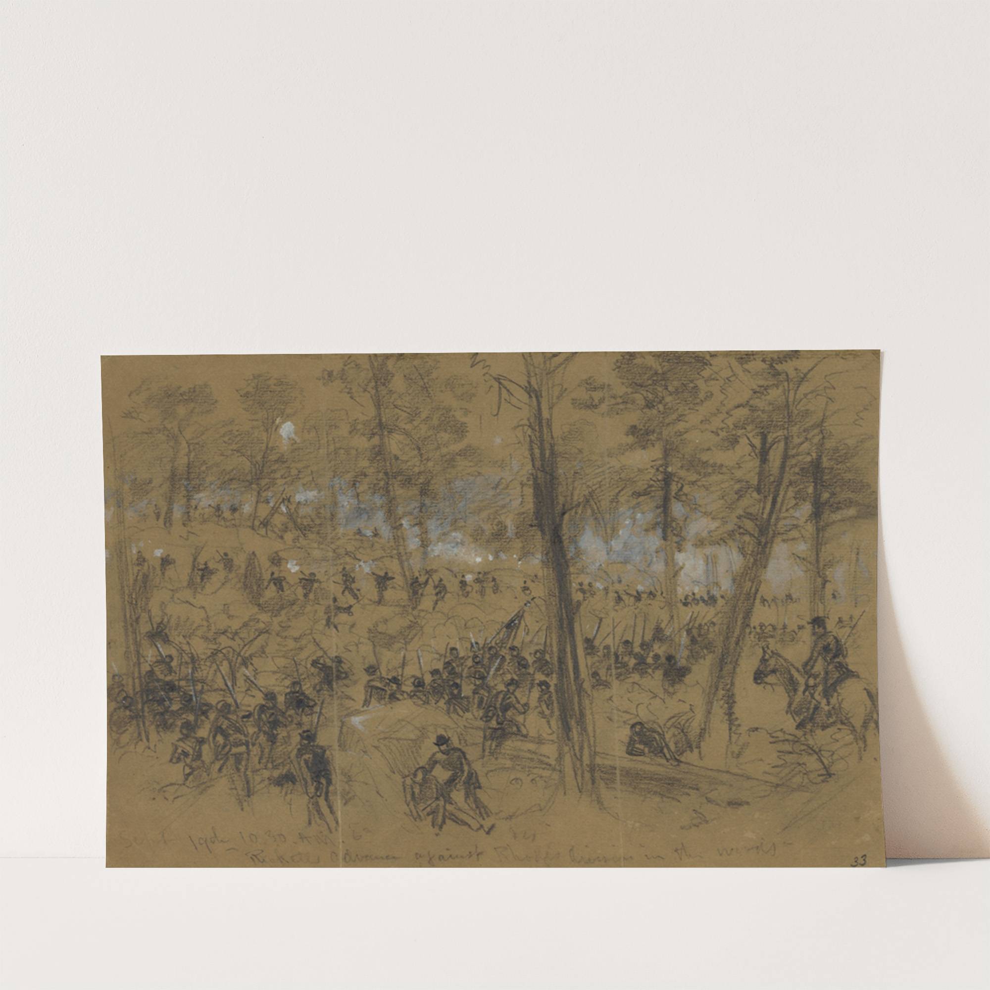 This art print showcases "Rickett's Advance Against Rhine Division in the Woods" by Alfred Rudolph Waud. The piece is rendered in a delicate, monochromatic sketch style on a tan-colored canvas, highlighting its historical and illustrative nature. The scene captures a...