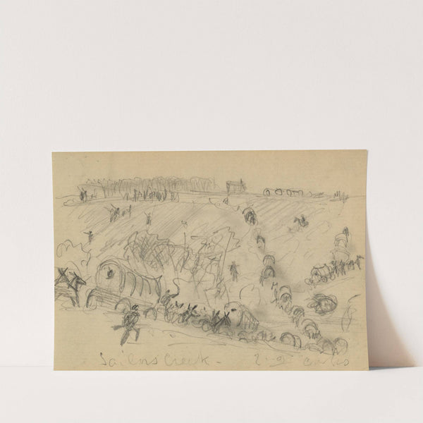 This dynamic sketch captures the chaotic aftermath of a battlefield scene in a pencil drawing style. The artist, Alfred Rudolph Waud, masterfully conveys movement and disorder through expressive, loose pencil strokes. The composition features a sprawling field littered with fallen...