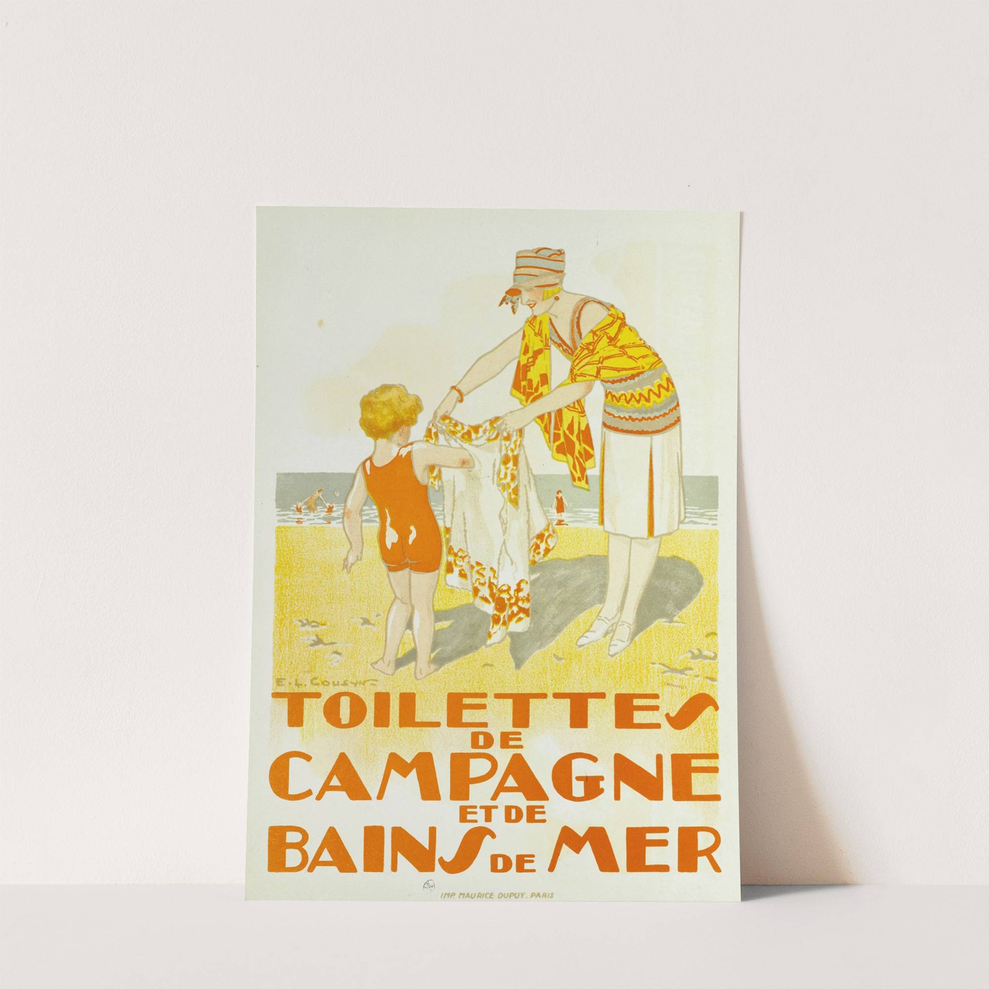 This vibrant art print depicts a charming summer scene by artist E.L. Cousyn titled "Toilettes de Camping et de Bain de Mer." The illustration features two figures under an opulent, sun-drenched sky. An adult woman with a slender build and...