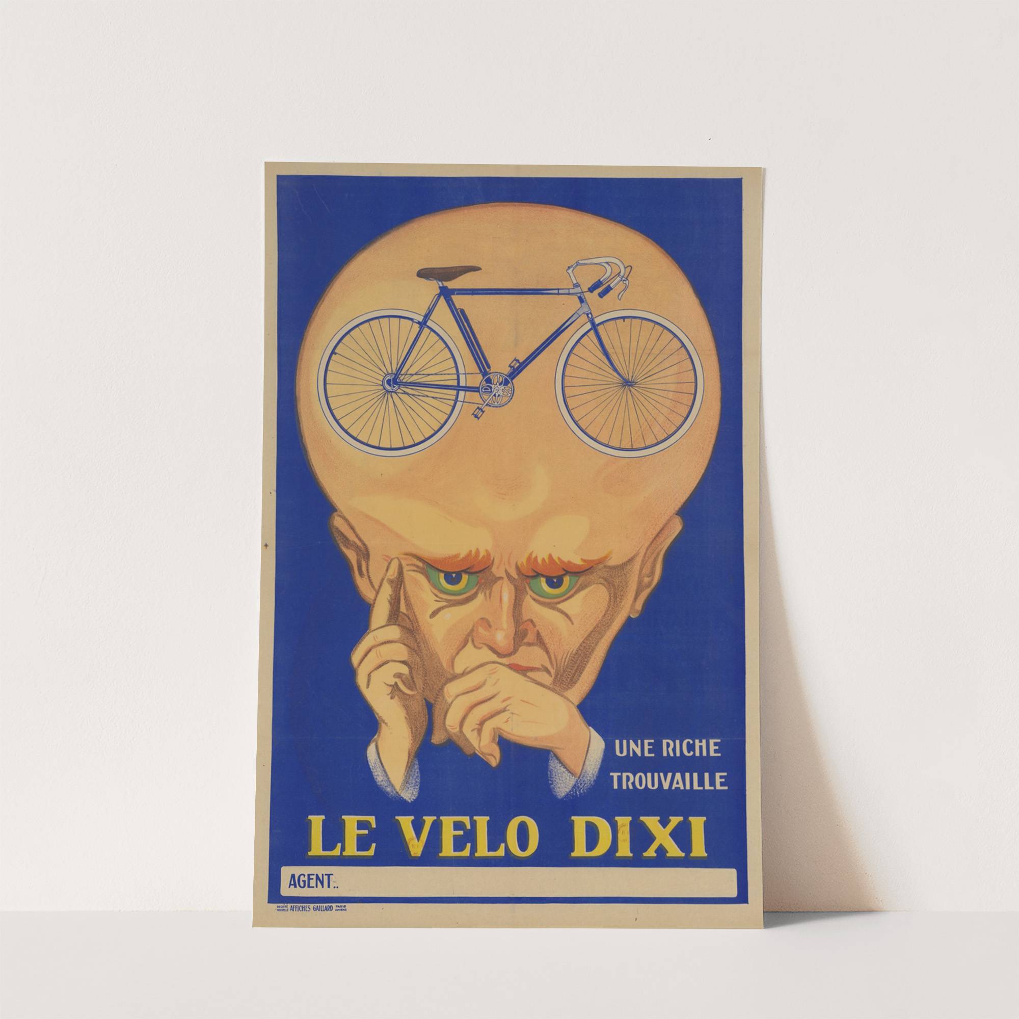 This vibrant art print features "Une riche trouvaille. Le vélo Dixi (1930)" by Affiches Gaillard, rendered in a striking, detailed cartoon style. The central figure is a bald man with intense green eyes and deeply furrowed brows, depicted from the...