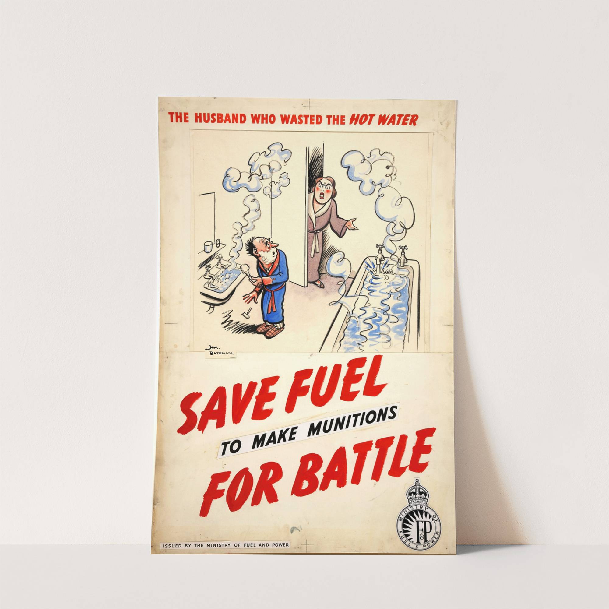 The husband who wasted the hot water. Save fuel to make munitions for battle (between 1939 and 1946) by Henry Mayo Bateman - Wall Art Print