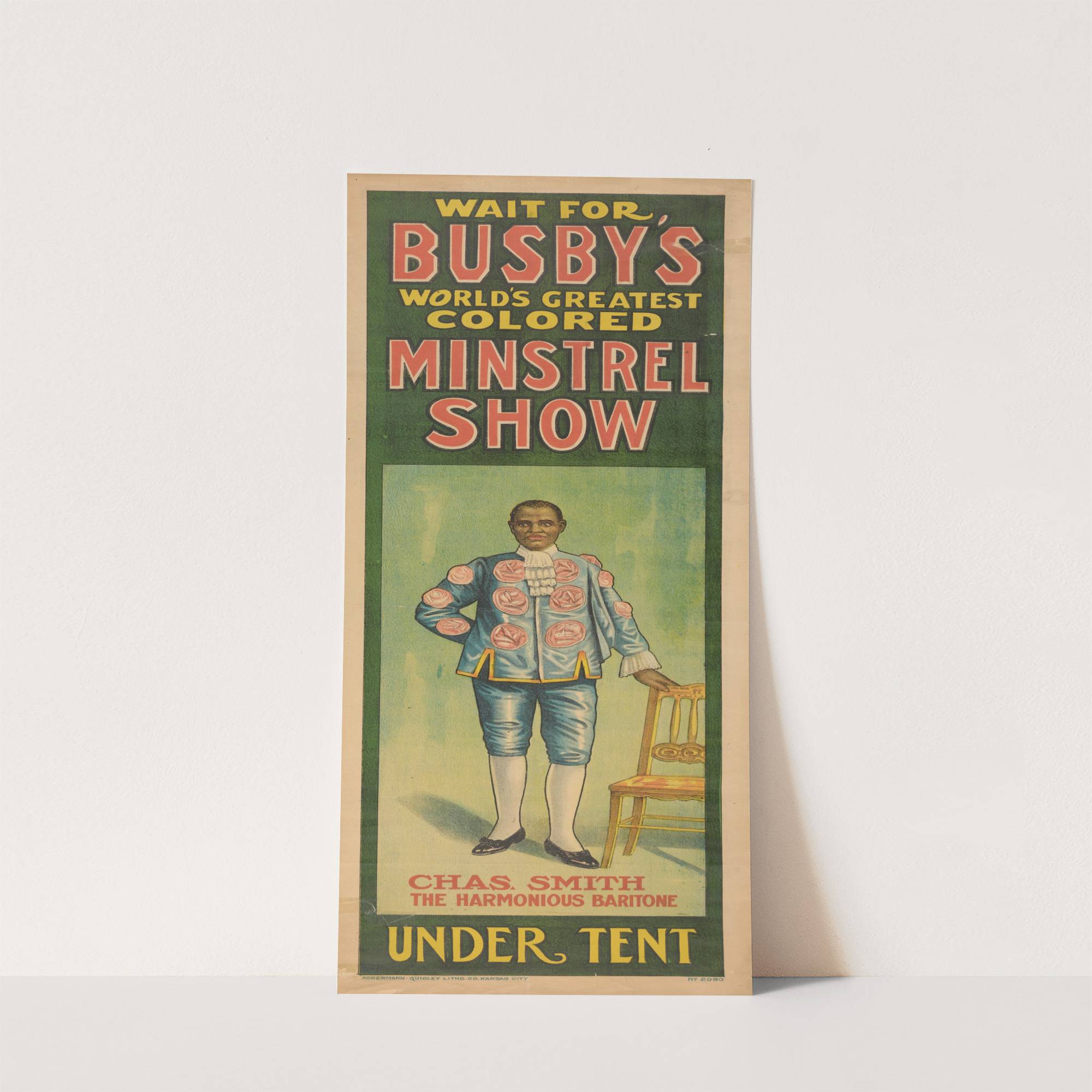 This vibrant art print showcases "Busby's Minstrel Show," a vividly colored advertisement poster from the 19th century. The central figure stands confidently, dressed in an elaborate blue and white minstrel costume adorned with red floral patterns and gold buttons. He...
