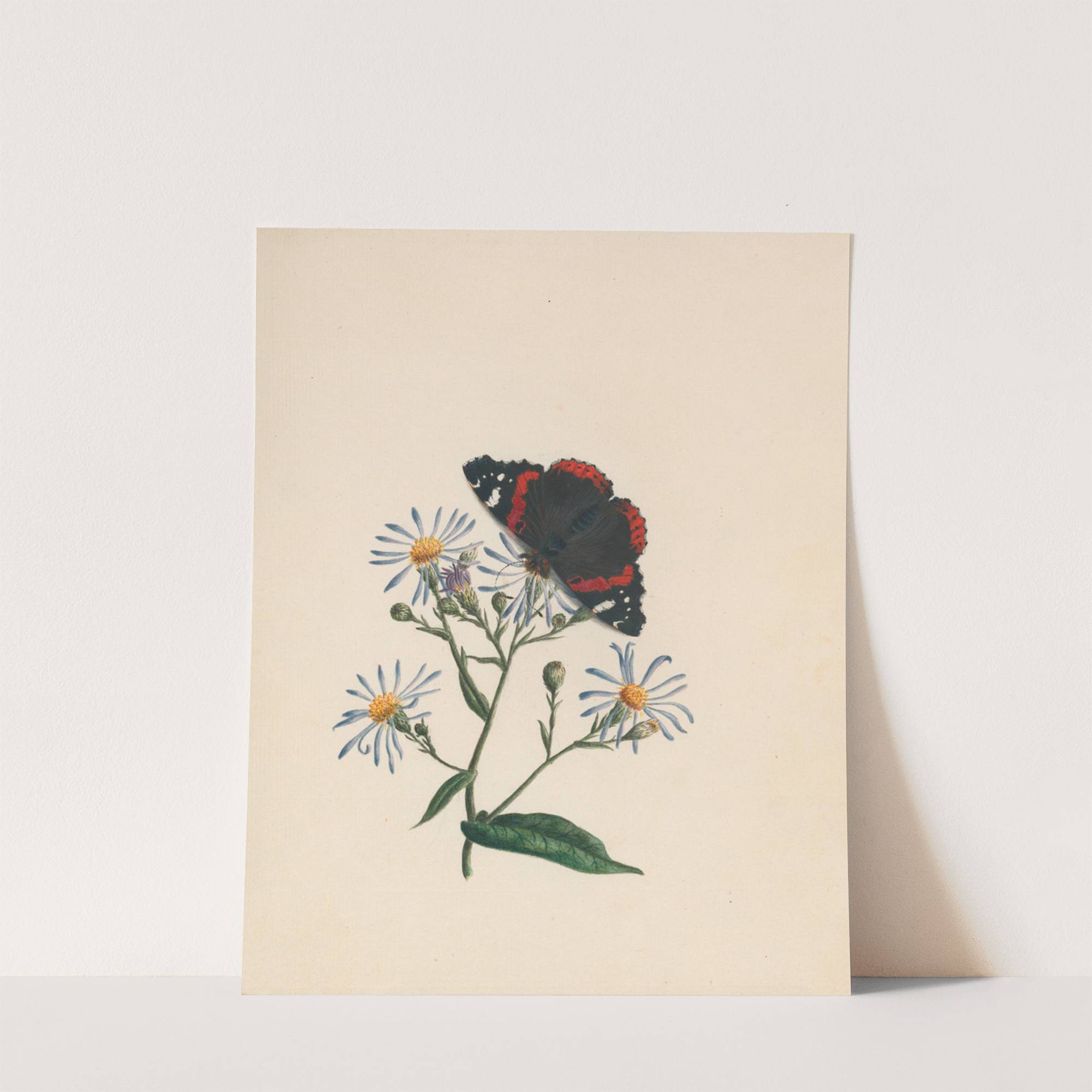 This art print features "Admiral butterfly and Aster – or Mich's. michaelmas daisy (1789)" by RB. F., beautifully capturing a fleeting moment in nature. At the center, a vibrant black butterfly with striking red edges hovers above a delicate cluster...