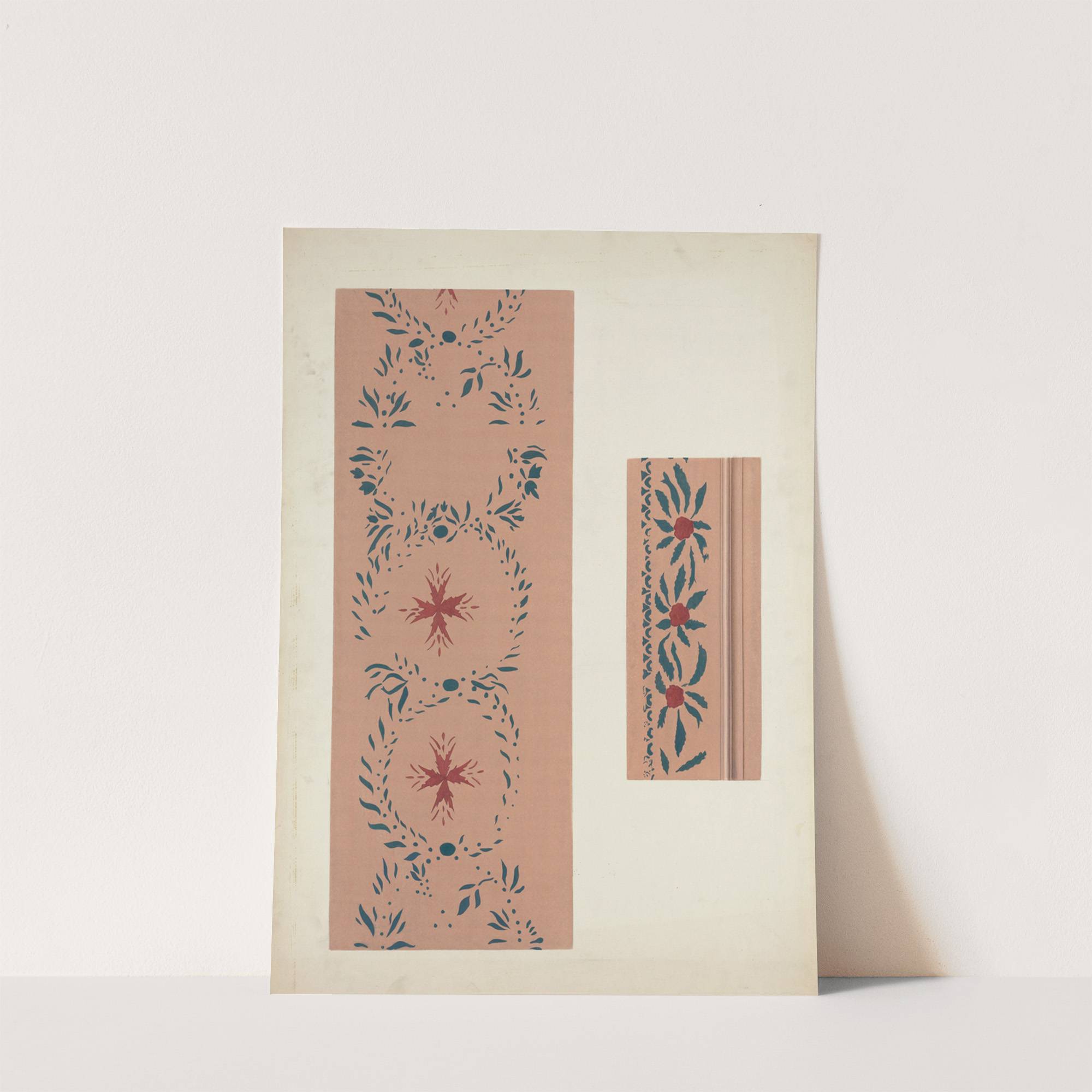 This art print features the "Wall Stencil" design by artist Ray Holden, showcasing a minimalist yet intricate composition. The main panel is dominated by a soft peach background that provides a subtle contrast to the darker elements within the design....