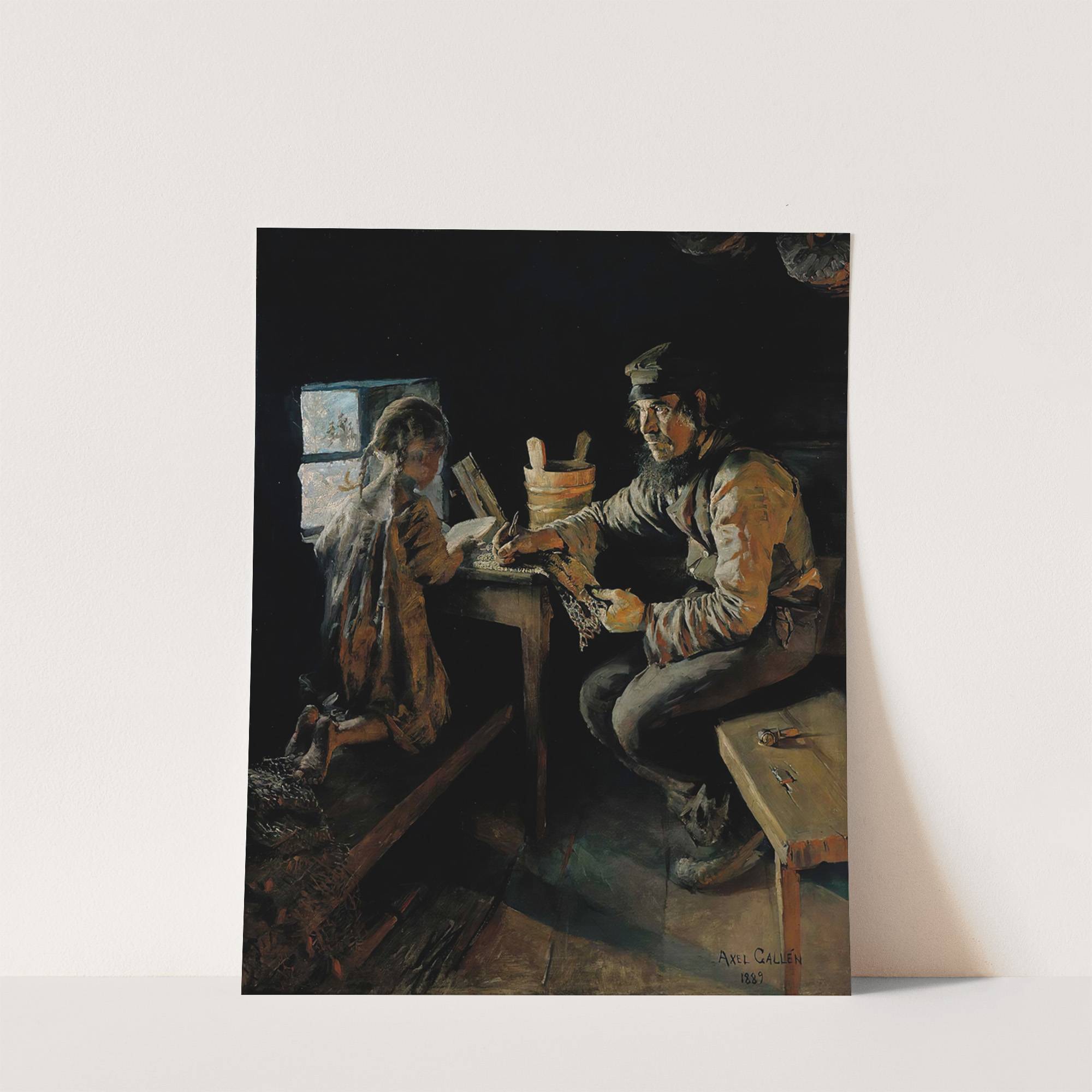 This artwork, titled "First Lesson" by Akseli Gallen-Kallela, beautifully captures a tender moment set in a rustic, dimly-lit cottage. The scene features a bearded man in traditional Finnish clothing, wearing a dark cap and brown vest over a checkered shirt,...