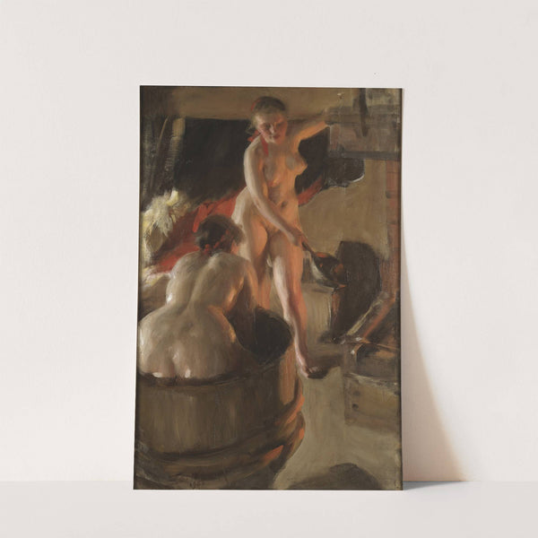This captivating painting features two nude women in an intimate rustic setting, masterfully captured by the renowned artist Anders Zorn. The scene exudes warmth and realism through its use of deep, earthy tones and soft brushstrokes. The standing woman, positioned...