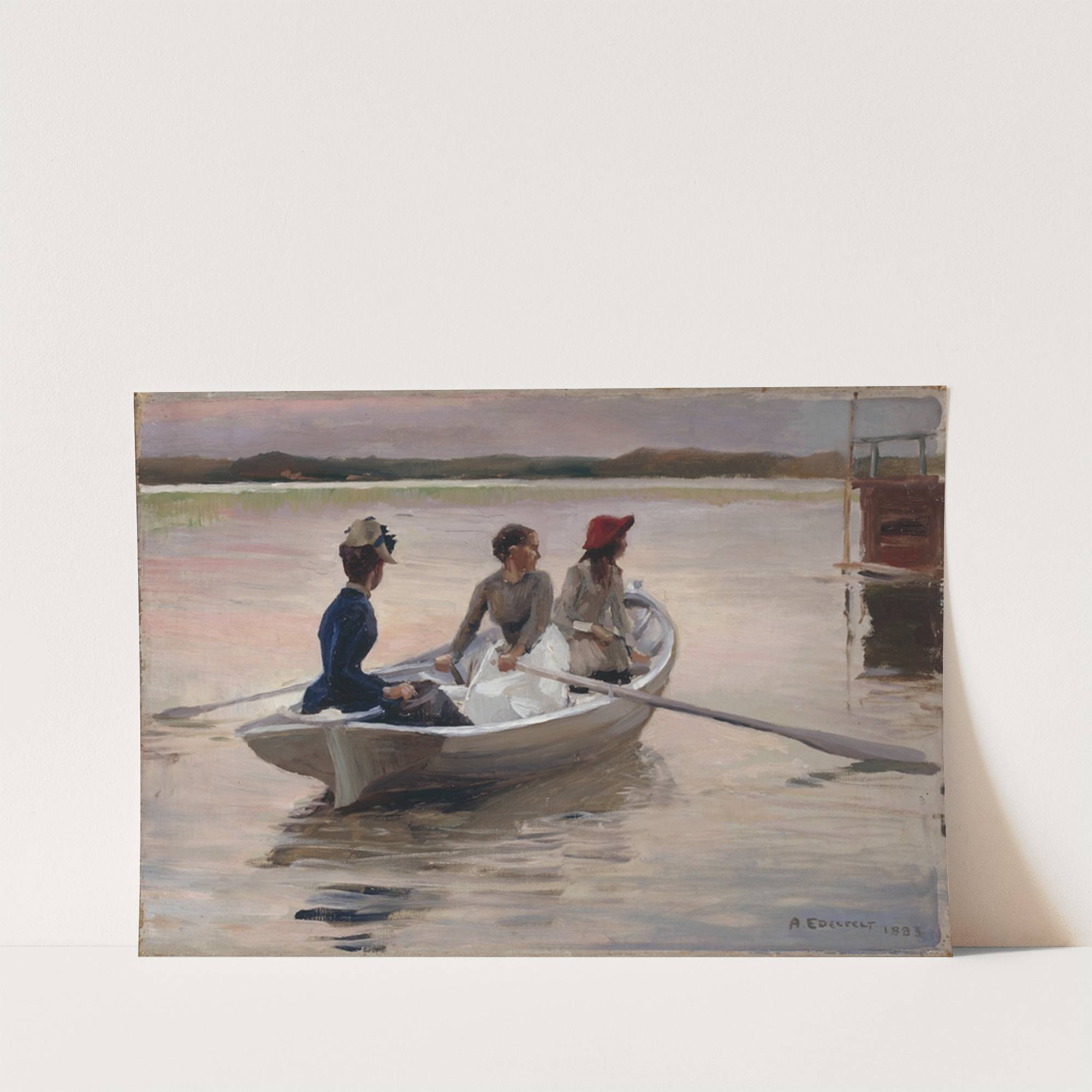 This vibrant art print features "Girls in a Rowing Boat" by Albert Edelfelt, capturing a serene moment on the water with impressionistic charm. The painting depicts three young girls seated in a small rowboat gently gliding across a calm lake....