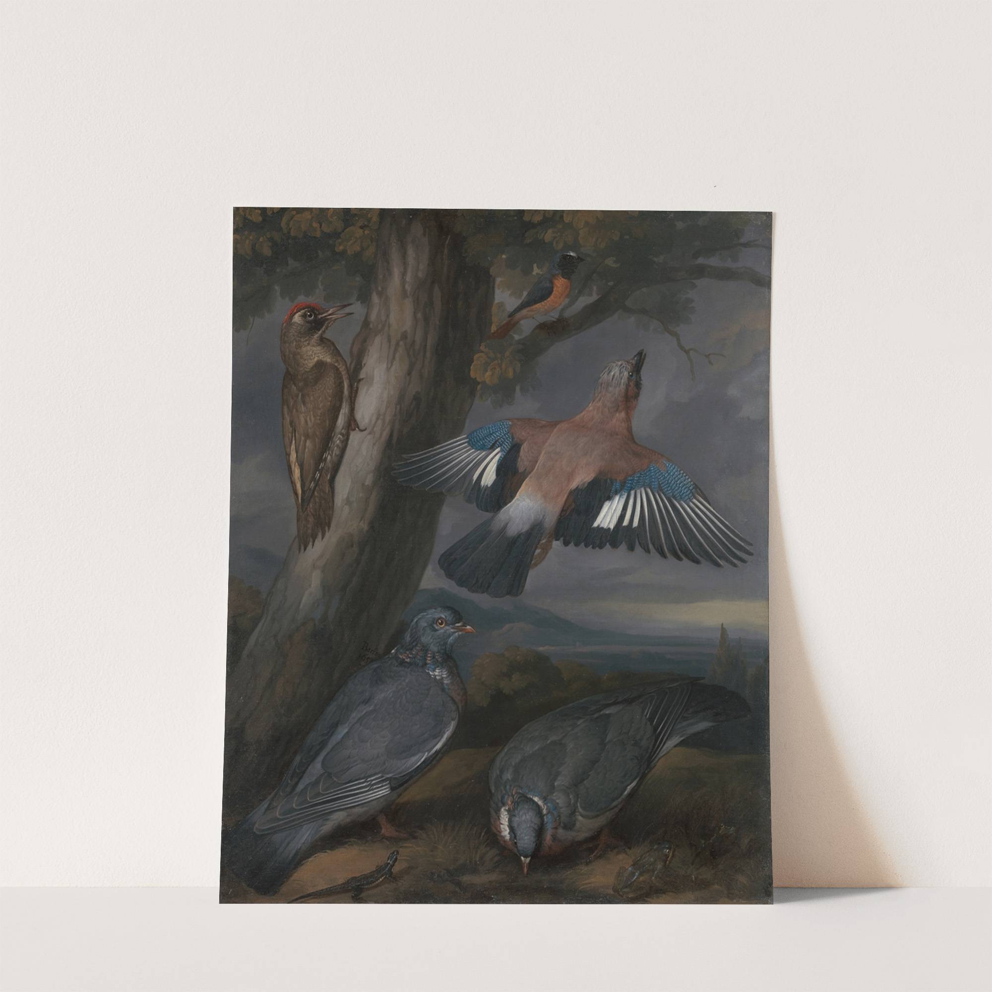 Jay, Green Woodpecker, Pigeons, and Redstart Landscape with a Green Woodpecker, a Jay, Two Pigeons, a Redstart, a Lizard and Two Frogs by Francis Barlow - Wall Art Print