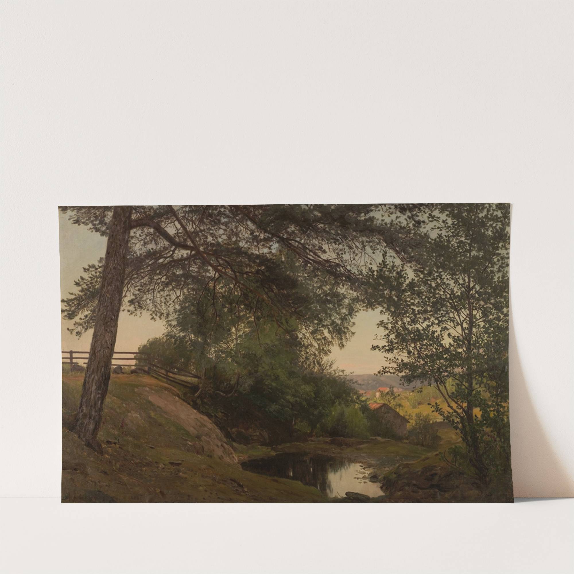 "Experience the serene beauty of nature with 'Mellom Trærne' by Amaldus Nielsen, a stunning landscape art print. This captivating piece beautifully captures the tranquil essence of an outdoor scene during twilight. The dominant feature is a tall pine tree on...
