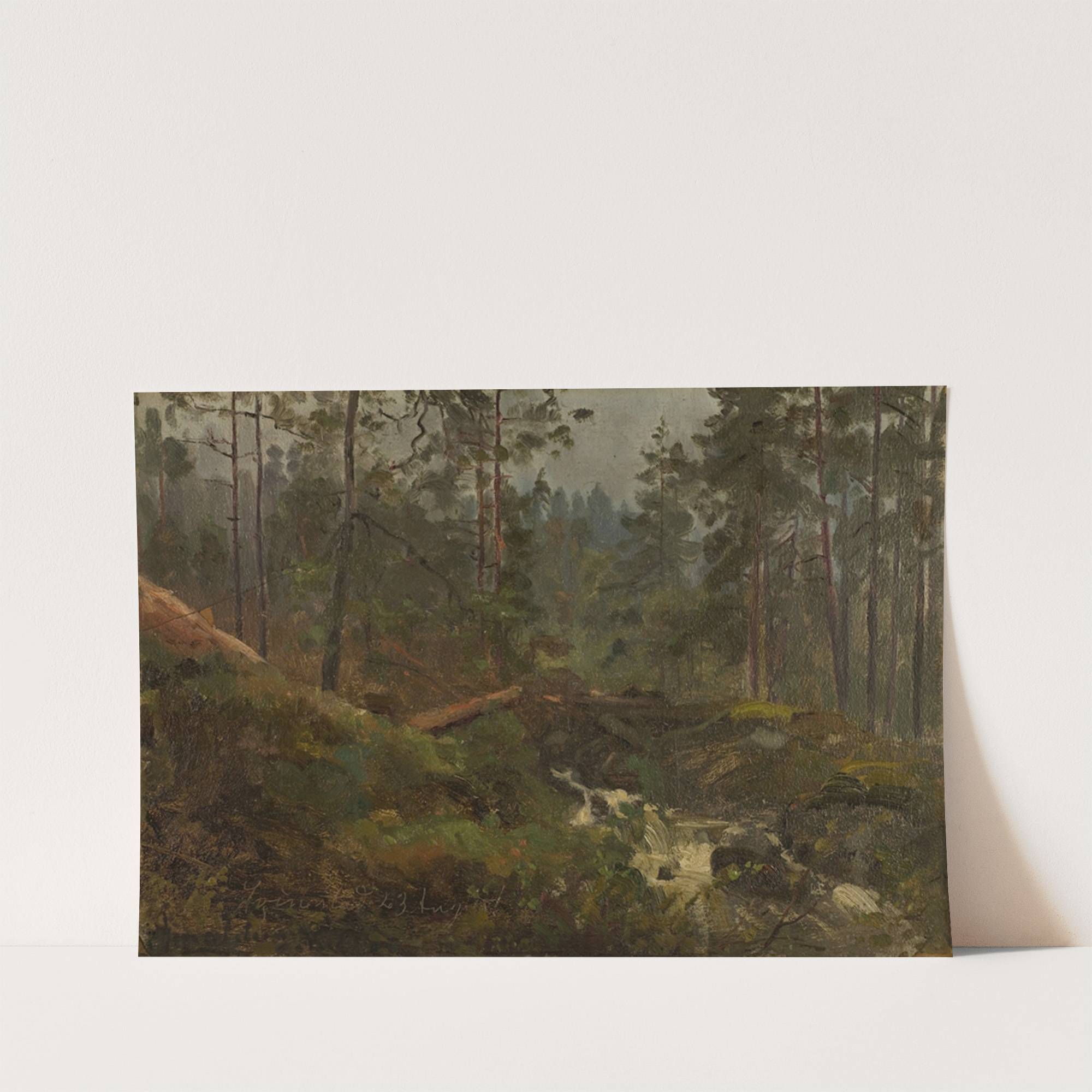 This art print features "Mandal" by artist Svinestad, showcasing a serene forest landscape with rich, natural detail. The composition captures towering pine trees with slender trunks extending upwards, their dark green needles creating a dense canopy overhead. The foreground is...