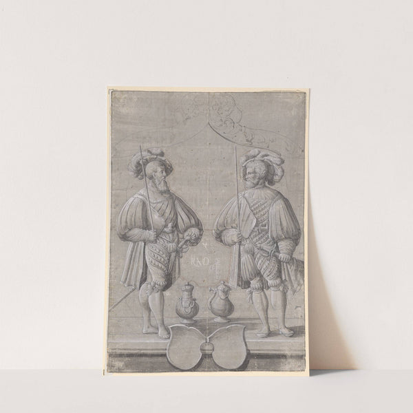 Scheibenriss mit zwei Reisläufern, darunter zwei leere Wappenschilde by Hans Rudolf Manuel - Wall Art Print