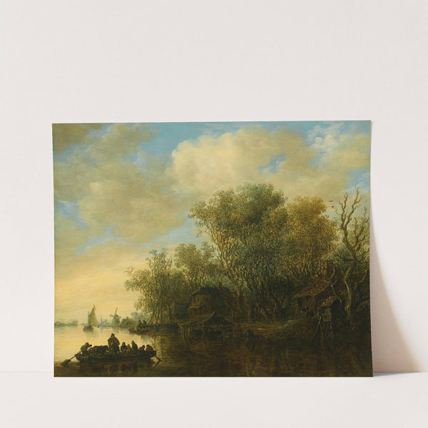 A River Landscape With A Fully-Laden Ferry Boat Approaching A Busy River Bank by Jan van Goyen - Wall Art Print