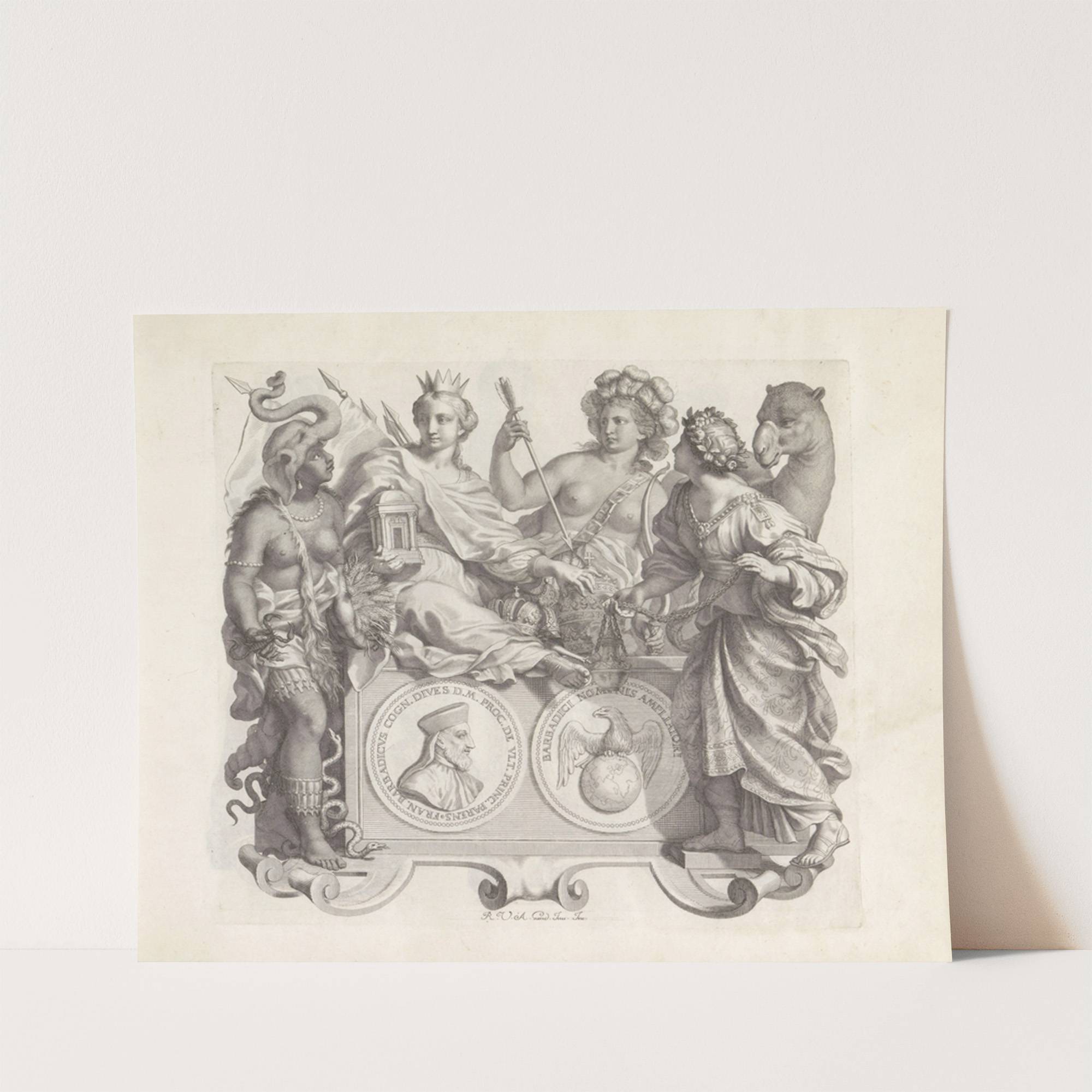 Portret van Francesco Barbarigo en de personificaties van Afrika, Europa, Amerika en Azië (1673-1743) by Robert van Audenaerde - Wall Art Print