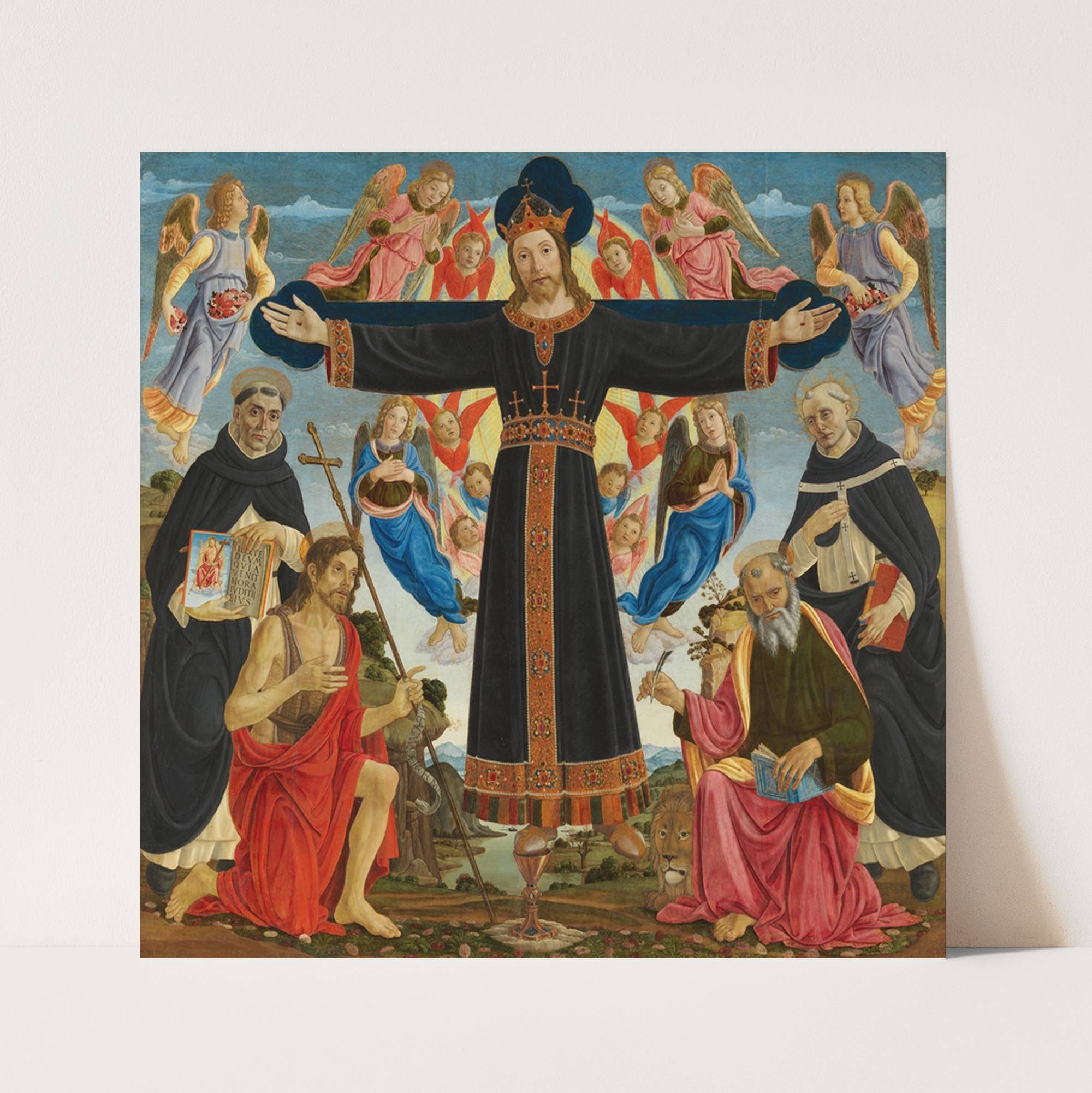 Christ on the Cross with Saints Vincent Ferrer, John the Baptist, Mark and Antoninus by Master of the Fiesole Epiphany - Wall Art Print