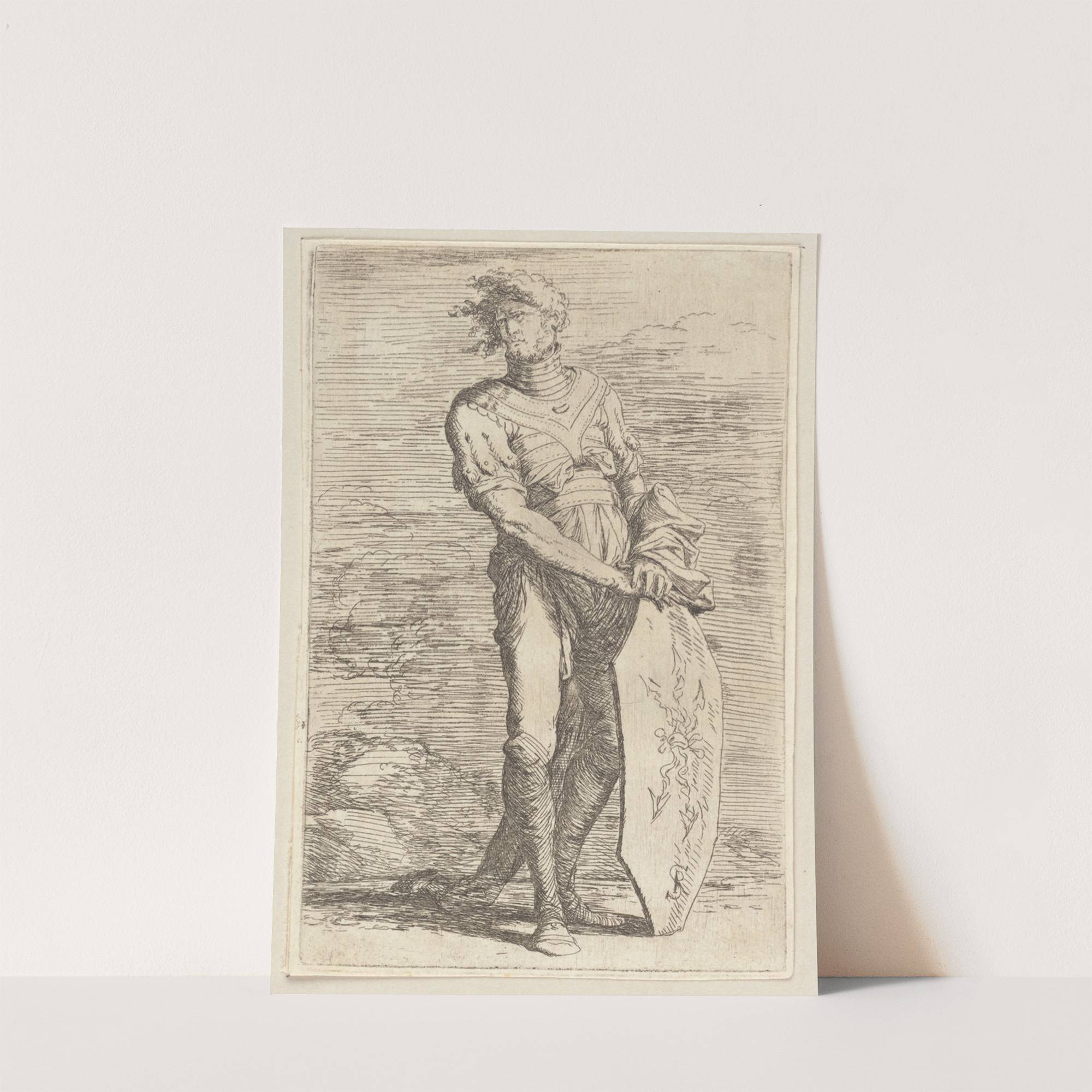 This exquisite black-and-white art print is a meticulous engraving titled "Soldier Holding a Shield" by the renowned artist Salvator Rosa. The soldier stands in a relaxed yet vigilant pose, holding an ornate shield with intricate patterns that cascade down its...