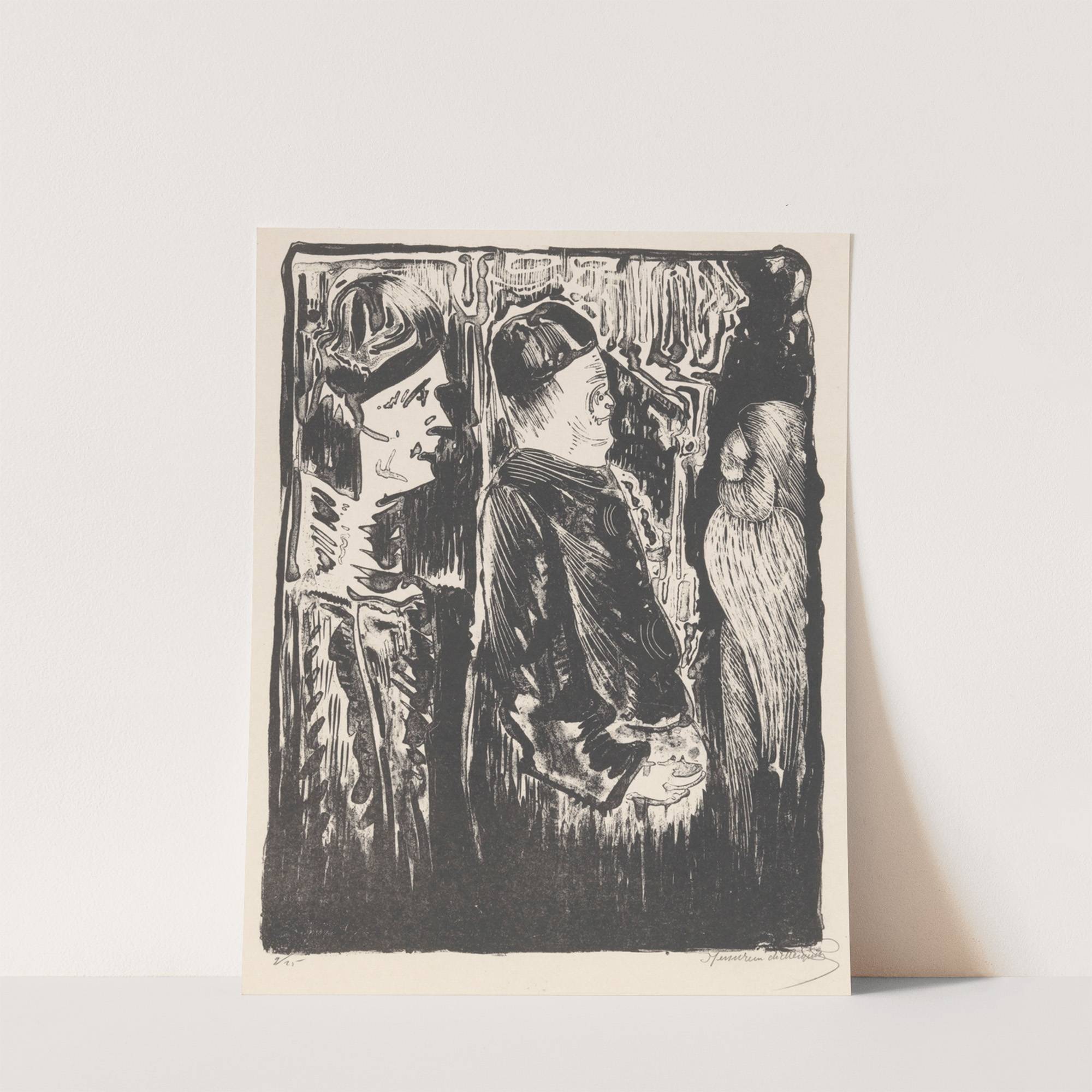 This striking black and white etching showcases three human figures in an abstract, almost cubist style. The artist uses bold, dramatic lines to create a sense of depth and movement within the composition. At the center, one figure is prominently...