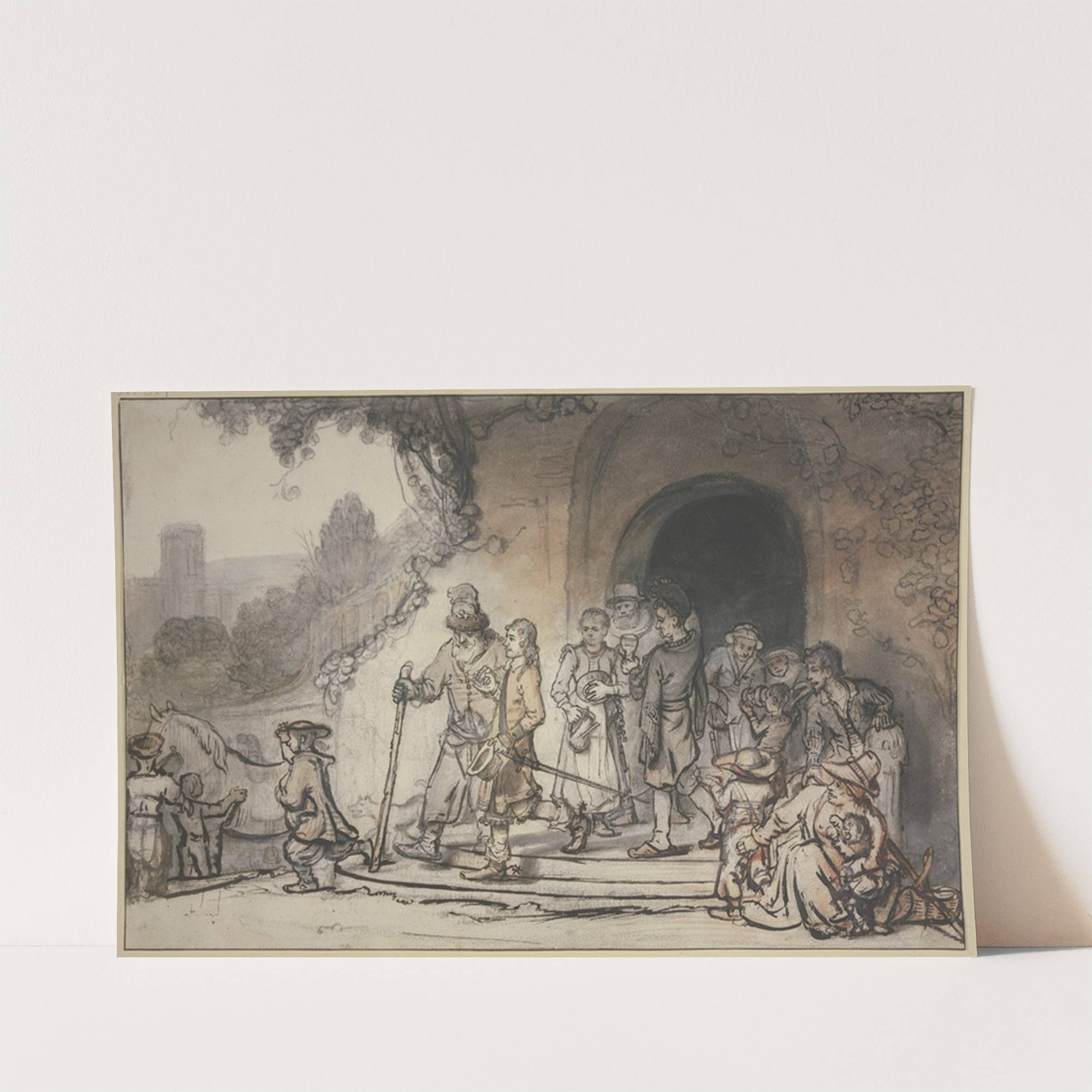 Ein junger Mann, gestiefelt und gespornt, tritt begleitet von seinem alten Vater und seiner Familie aus einem Haus, im Hintergrund halten Diener sein Pferd by Samuel van Hoogstraten - Wall Art Print