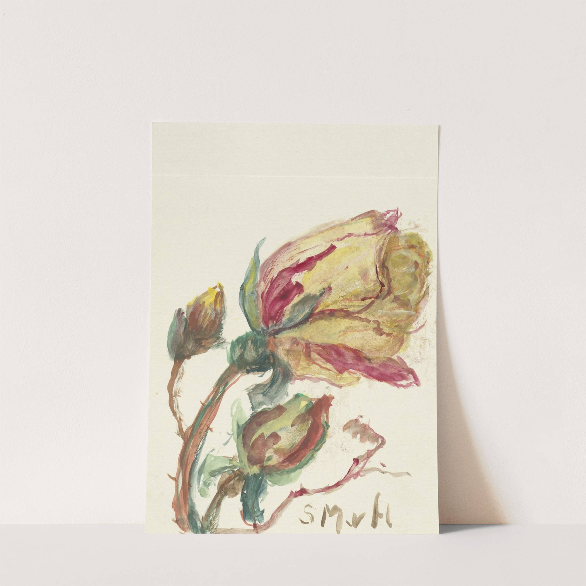This watercolor painting by Sientje Mesdag Van Houten features a single, elegantly blooming rose with partially opened petals. The rose's delicate, curved petals exhibit a striking combination of warm colors: soft yellows, deep pinks, and subtle greens, creating a sense...