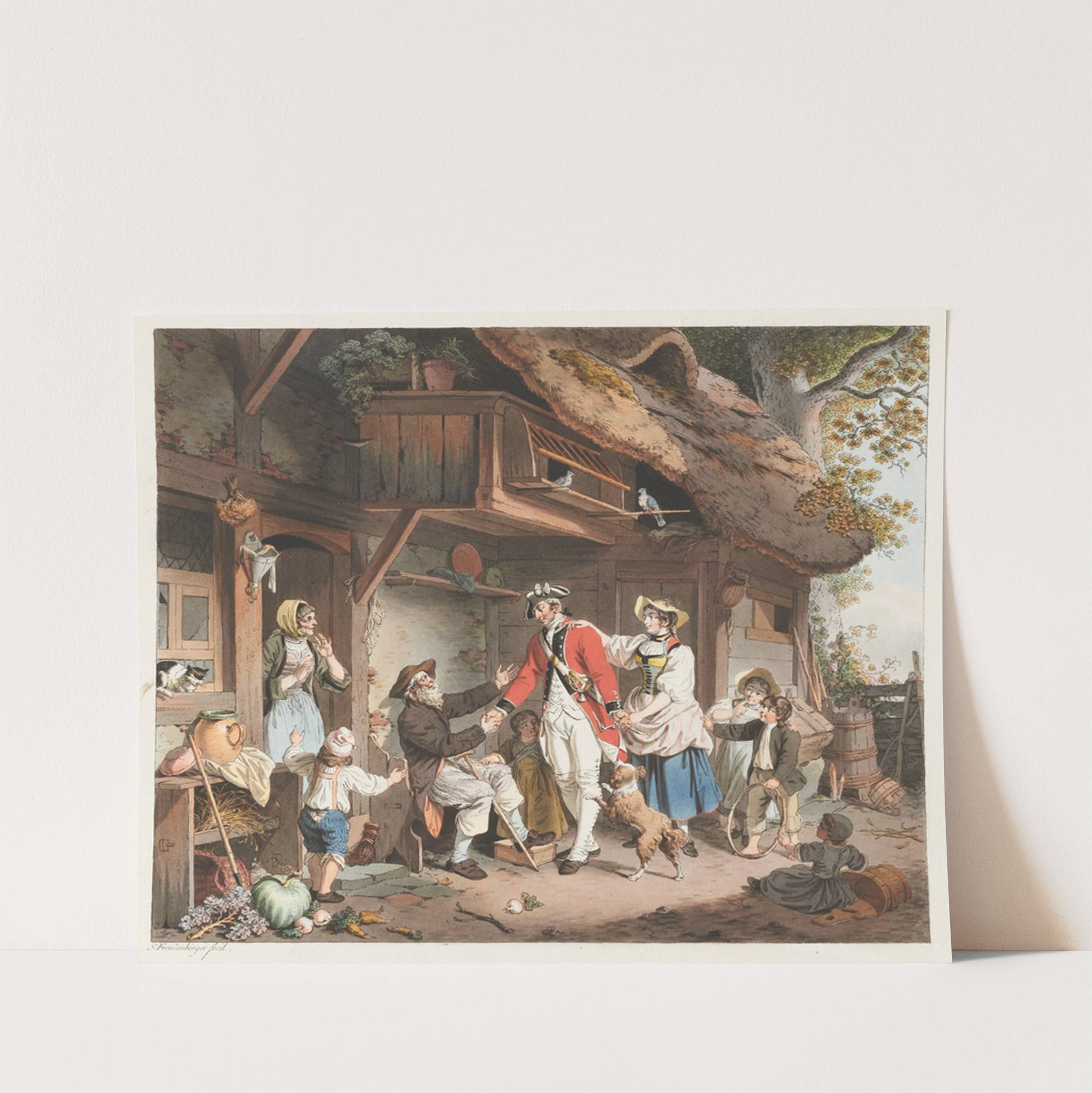 This charming print features "Retour du Soldat Suisse dans le Pays" by Sigmund Freudenberger, capturing a quaint rural scene with remarkable detail and color. The composition showcases a rustic wooden cottage nestled under an overhanging thatched roof, surrounded by nature's...