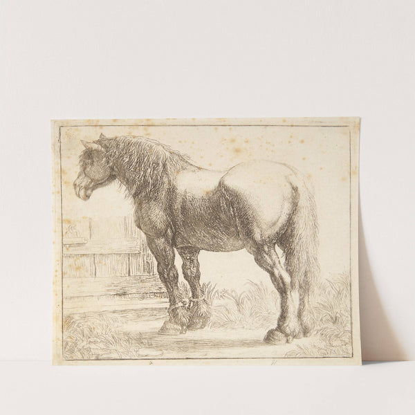 This exquisite monochromatic drawing captures the sturdy presence of a Shire horse standing in a serene rural setting. The artist, Simon de Vlieger, has masterfully employed fine line techniques to create an intricate and lifelike portrayal of the horse's textured...