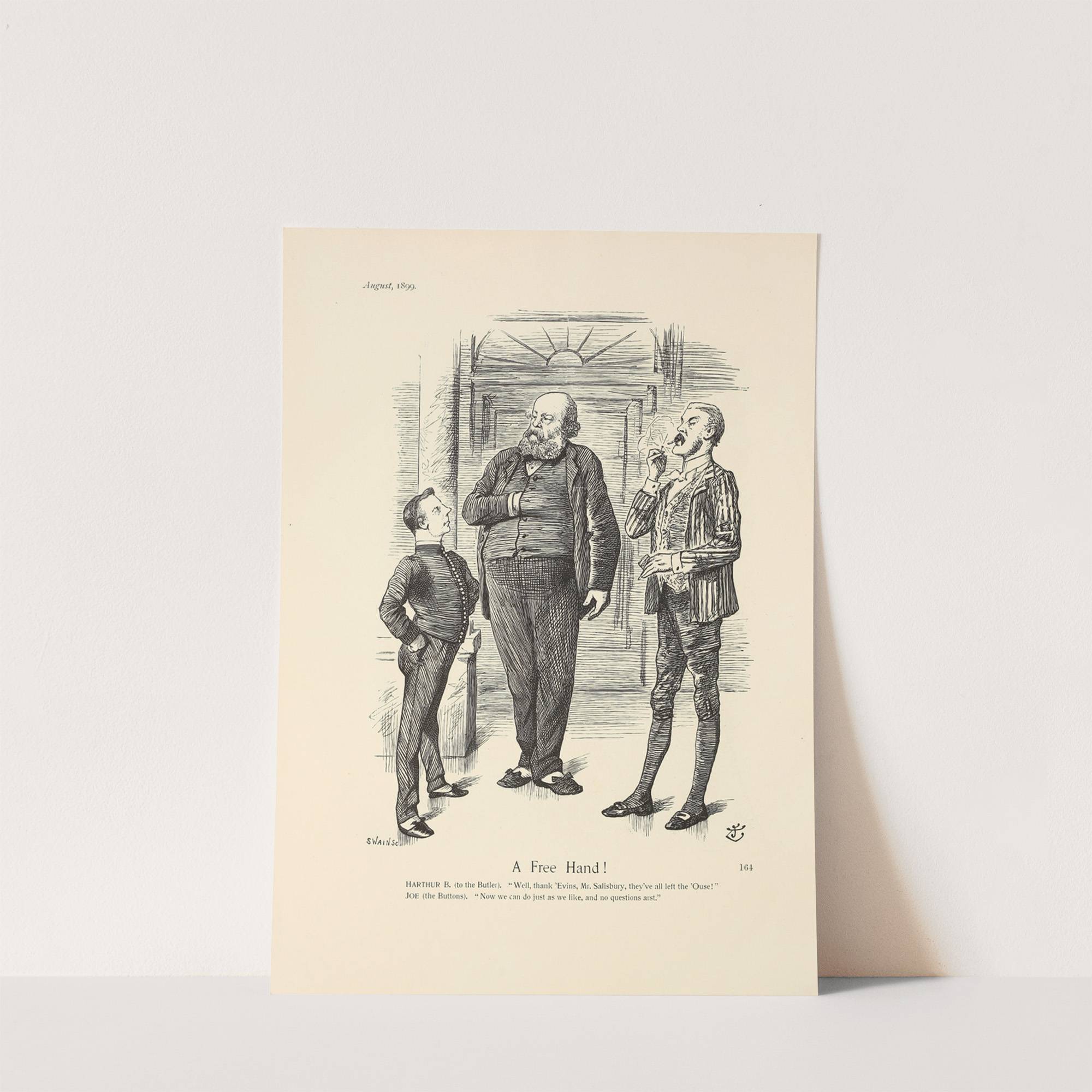 This black-and-white caricature print features three men standing in front of a doorway with arched detailing. The central figure is a stout man with a round face, dressed in formal attire including a suit and tie. His right hand is...