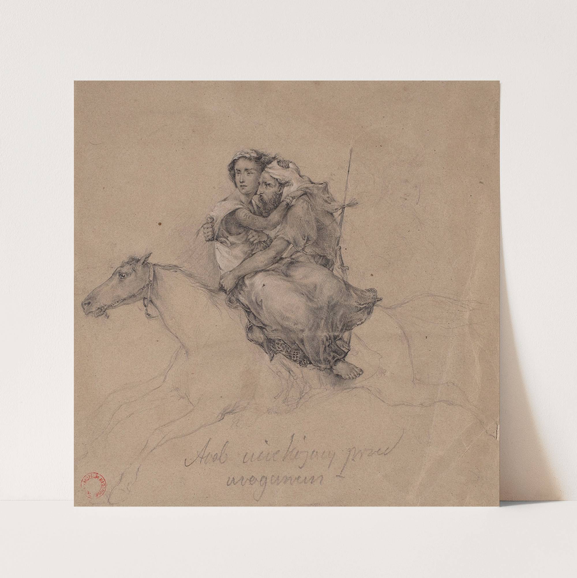 Arab and a woman running away from a hurricane on horseback (1870) by Stanisław Chlebowski - Wall Art Print