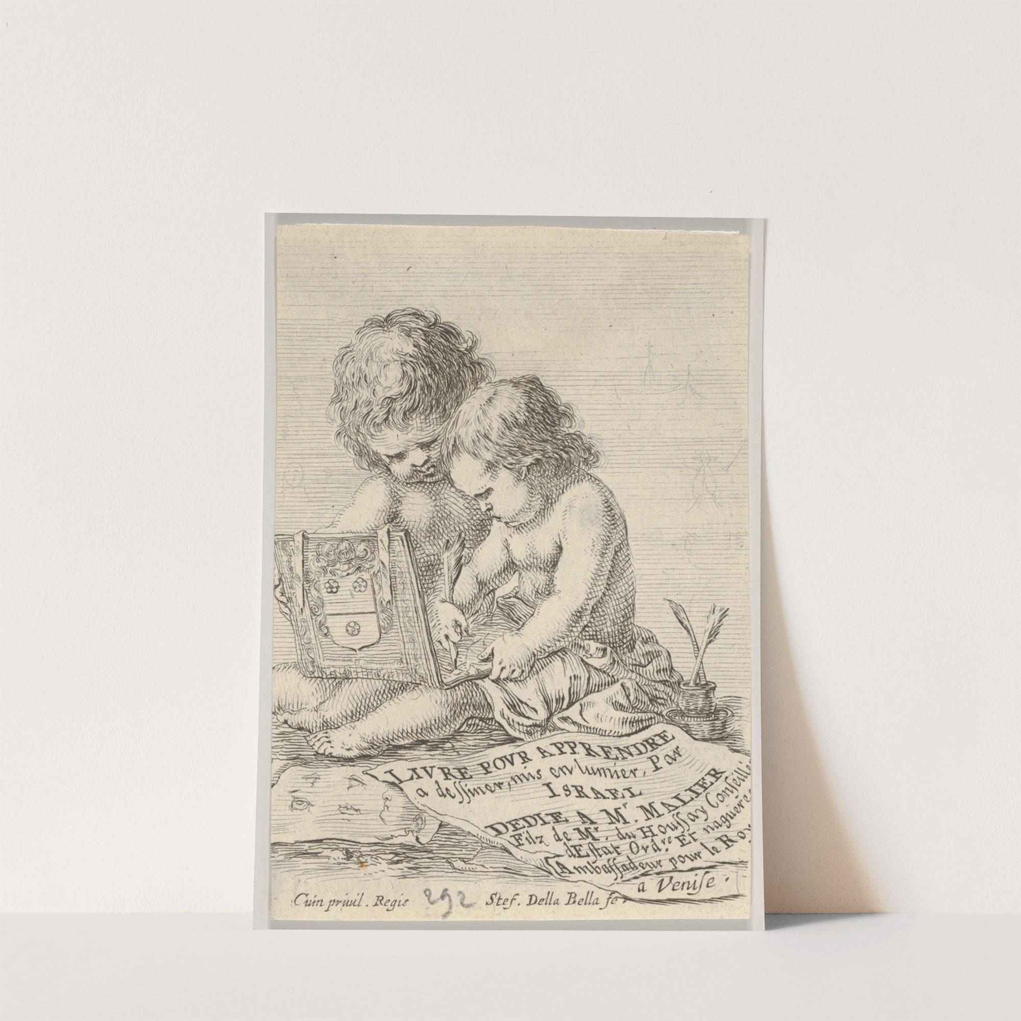 Plate 1; two children sitting on the ground, the child on the right drawing while the child on the left holding the album (1649) by Stefano Della Bella - Wall Art Print