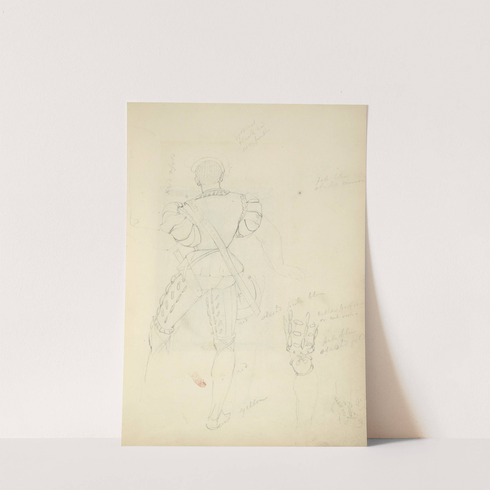 Back view of a man in breeches and doublet, with horn and knife in a sheath; detail of leg and foot by Stewart Watson - Wall Art Print