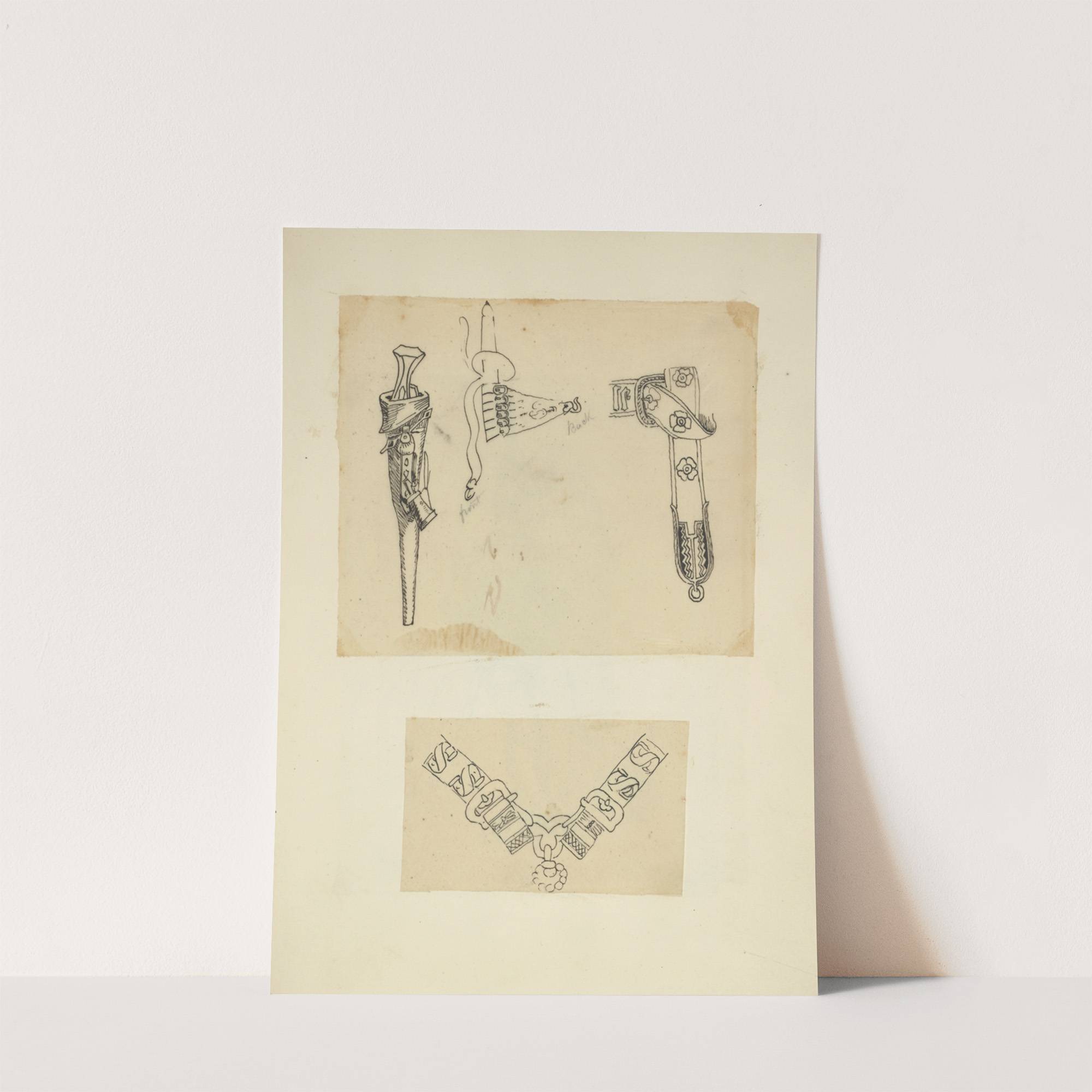 Knife in a sheath, belt with attachment and hook, belt buckle; Two buckles joined with ornamental hardware by Stewart Watson - Wall Art Print
