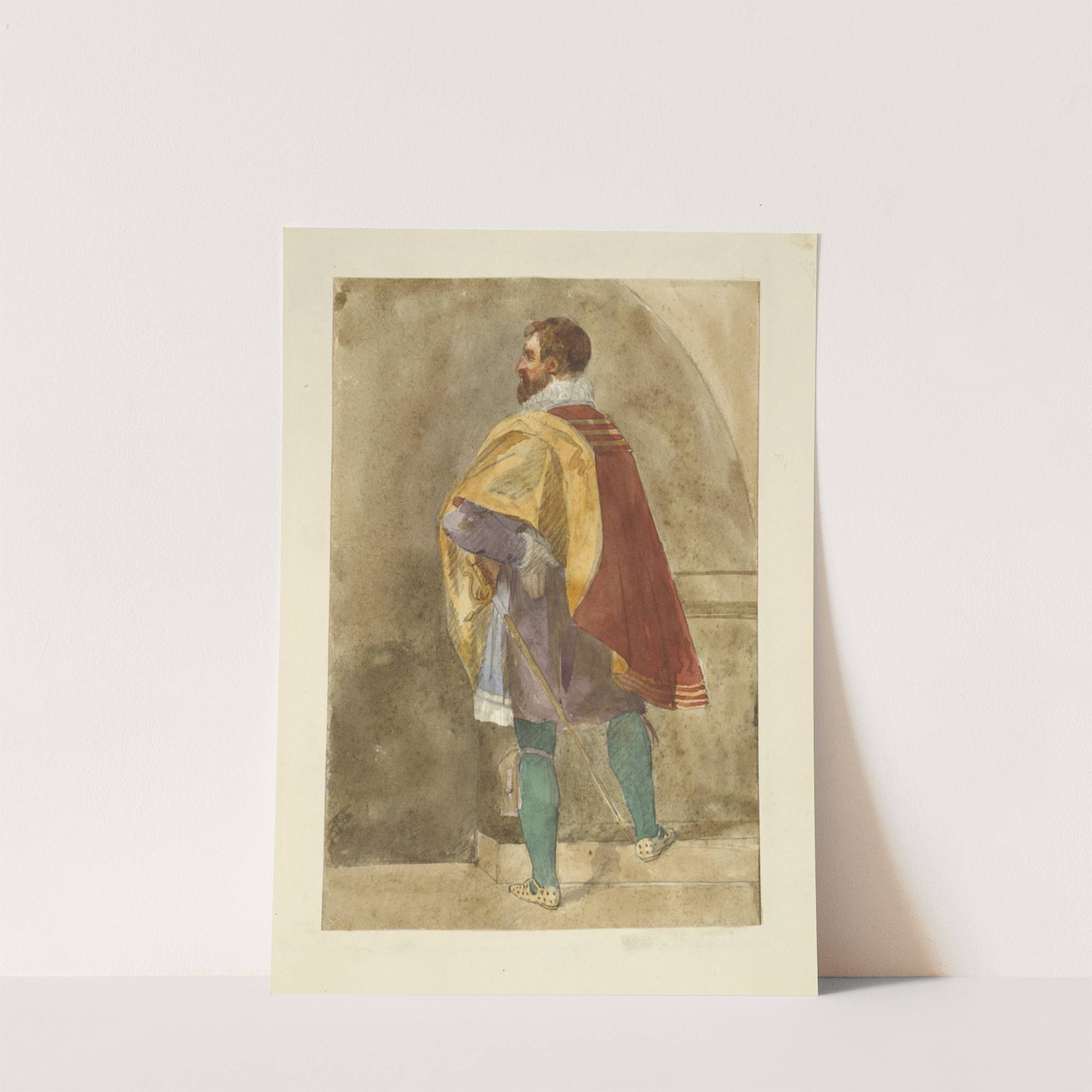 Man in maroon cape with gold lining, purple tunic and green tights by Stewart Watson - Wall Art Print
