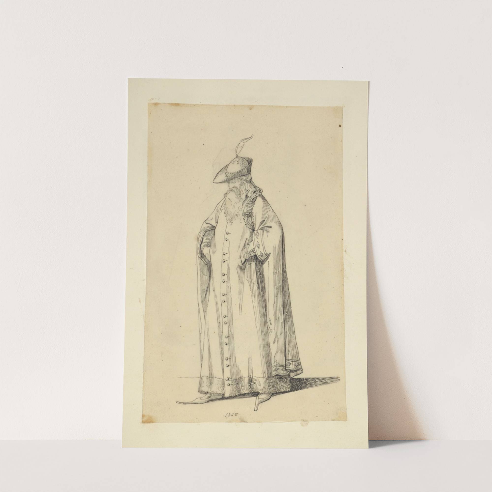 Man with beard in long cape, hat with plume, and pointed shoes by Stewart Watson - Wall Art Print