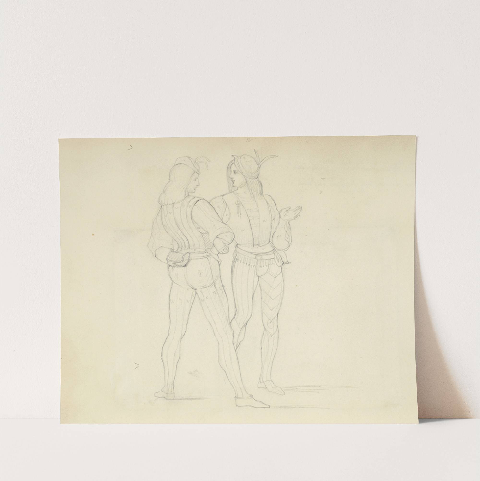 Two men wearing tights, doublets, belts with purses, and hats, Lucan Signorelli de Cartona 1439 by Stewart Watson - Wall Art Print