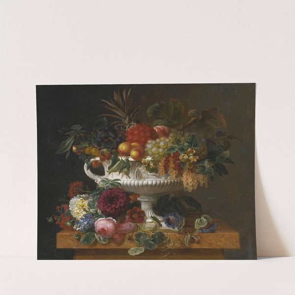 A Classical Urn with Gooseberries, Apricots, Currents, Cherries, Peaches and Pineapple set on a Flower Covered Plinth by Johan Laurentz Jensen - Wall Art Print