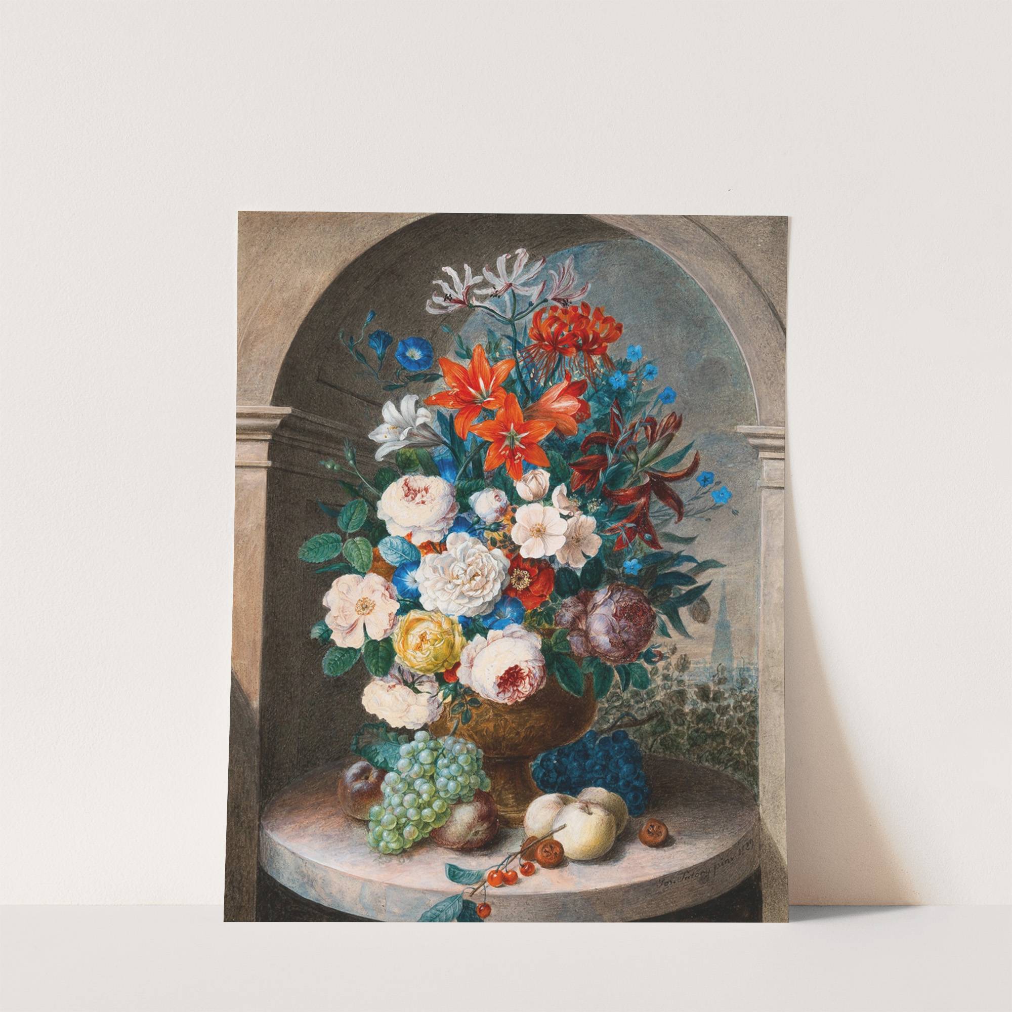 A flower still-life, in the manner of 17th century Netherlandish artists, Saint Stephen’s cathedral in the far distance by Joseph August Satory - Wall Art Print