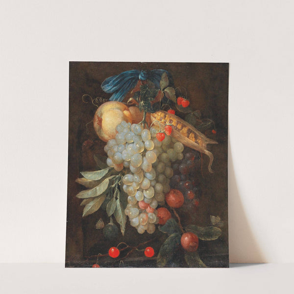 A hanging bouquet of fruit, including grapes, a pear and corn on the cob, with butterflies by Joris van Son - Wall Art Print