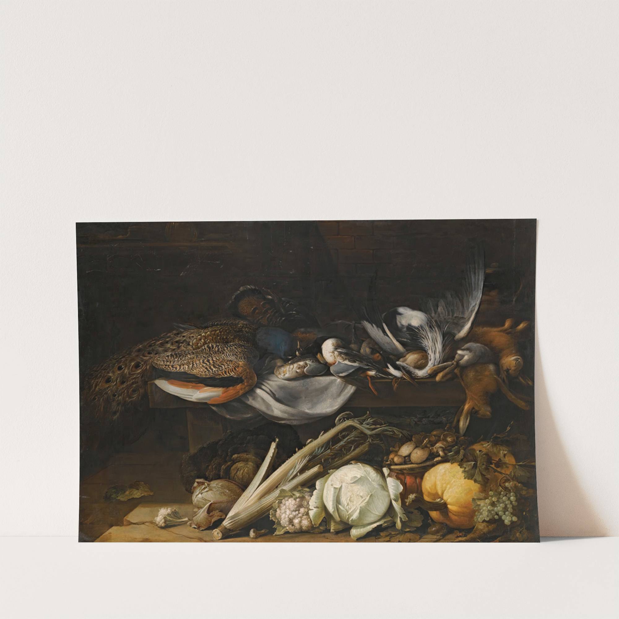 A Still Life Of Song Birds, A Peacock And Rabbits On A Ledge With A Pumpkin, A Cabbage, A Cauliflower, Celery, Mushrooms And Grapes by Flemish School - Wall Art Print