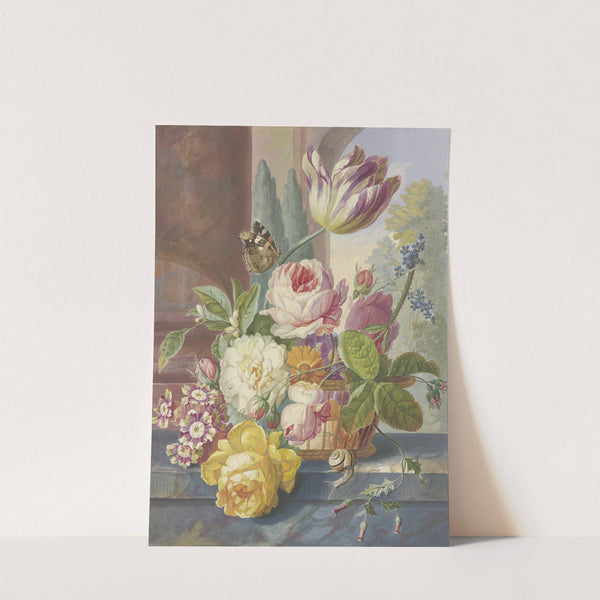 Ein Blumenstrauß in einem Korb, auf einer Tulpe ein Schmetterling, vorne eine Schnecke by Johannes Christiaan Roedig - Wall Art Print