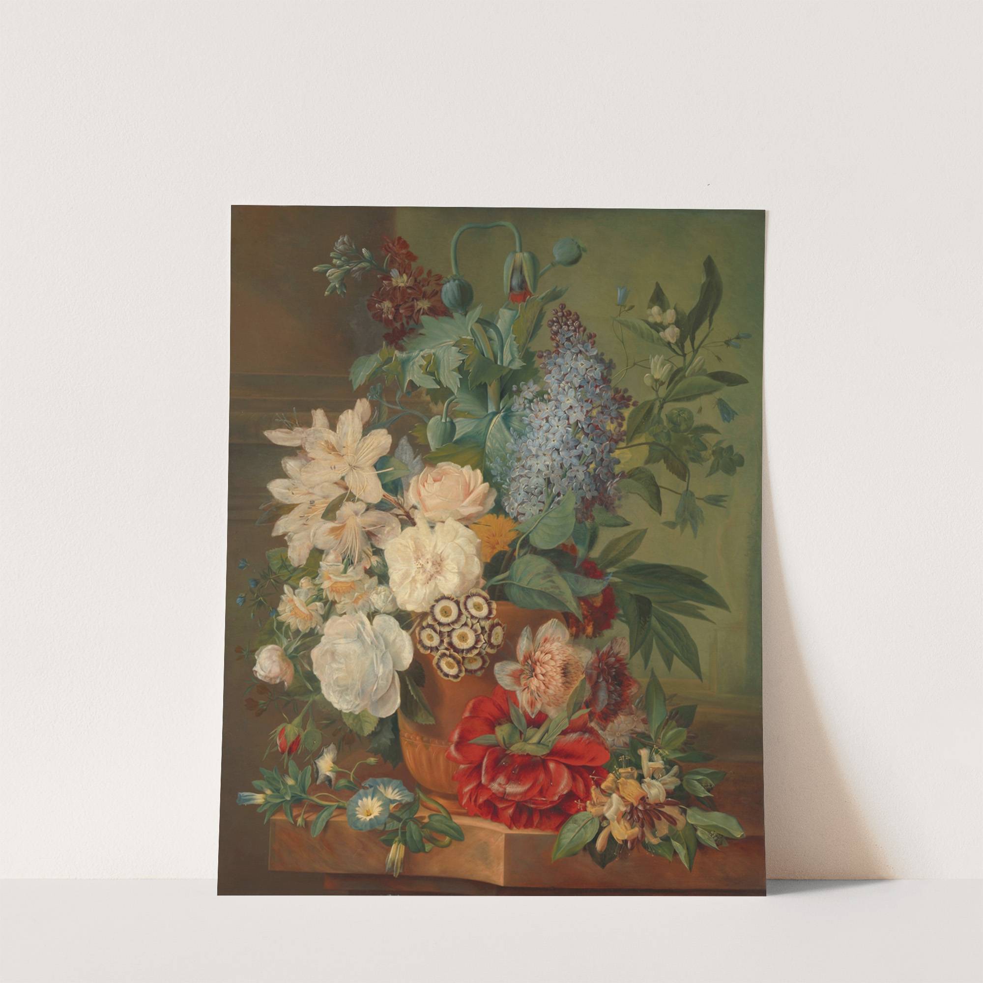 This art print features "Flowers in a Terra Cotta Vase" by Albertus Jonas Brandt, showcasing a beautifully detailed still-life composition. The vase is filled with an array of lush, vibrant flowers, each rendered with intricate realism and rich coloration. Prominent...
