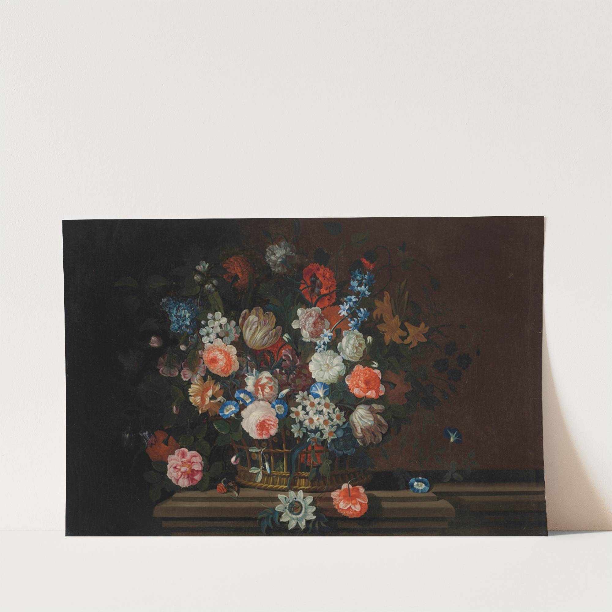 Flowers in a wicker basket on a stone ledge by Simon Hardimé - Wall Art Print