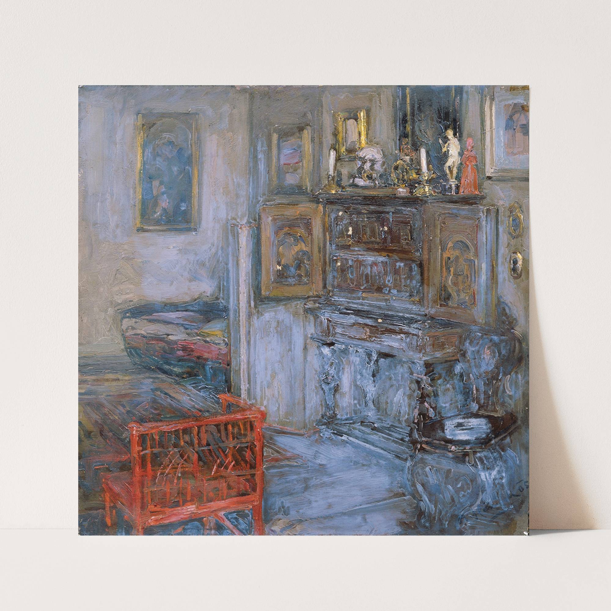 This art print features "Interieur" by Alois Hänisch, showcasing a warm yet enigmatic interior scene rendered in an impressionistic style. The painting captures the dimly lit room with a mix of soft blues and earthy browns, creating a tranquil but...
