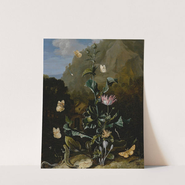 Still life of a thistle and other flowers surrounded by moths, a dragonfly, a lizard and a snake, in a landscape by Otto Marseus van Schrieck - Wall Art Print