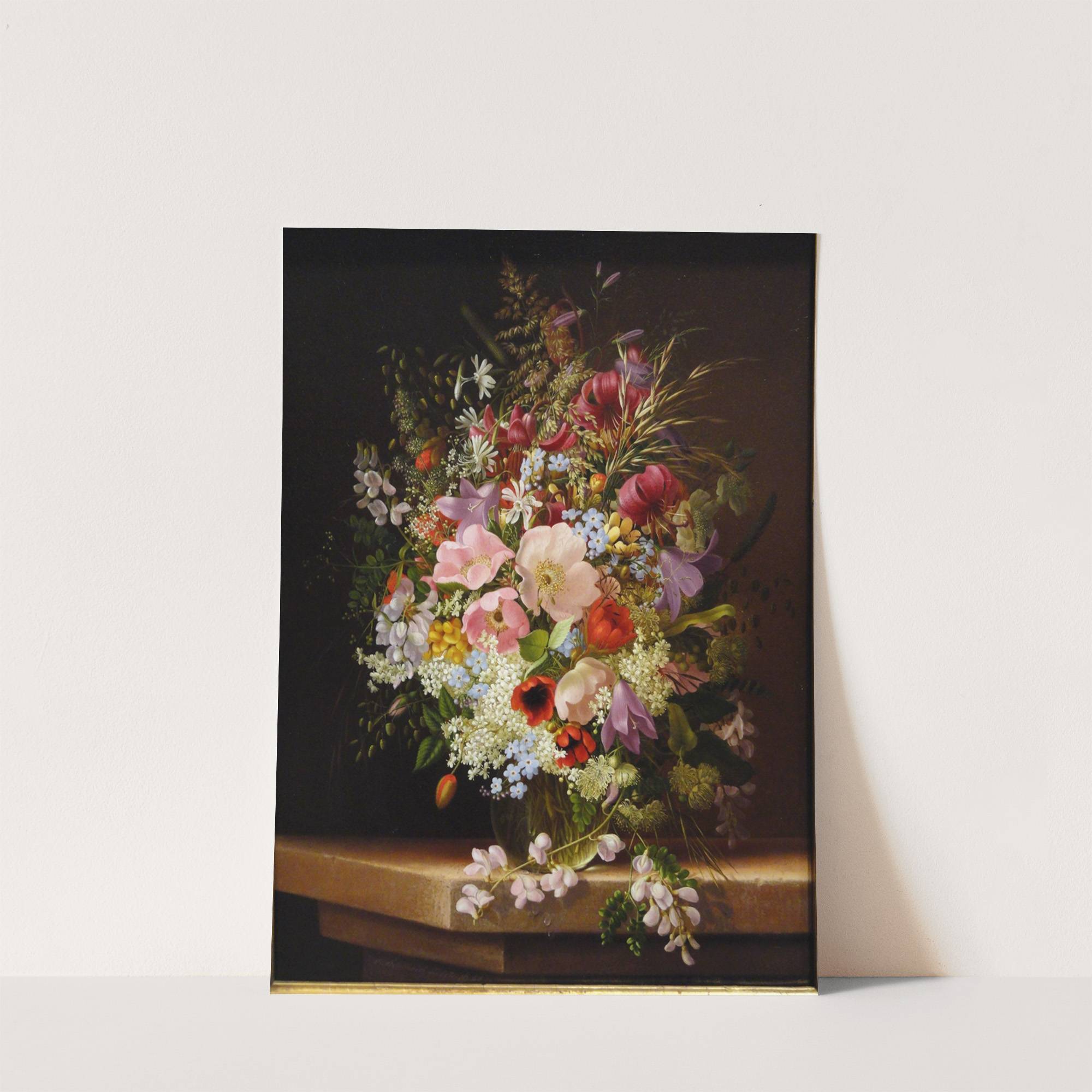 This exquisite print captures "Still Life of Flowers" by Adelheid Dietrich, showcasing an intricately arranged bouquet against a dark background. The composition bursts with vibrant colors and an assortment of flowers including pink and white peonies, delicate white blossoms, red...