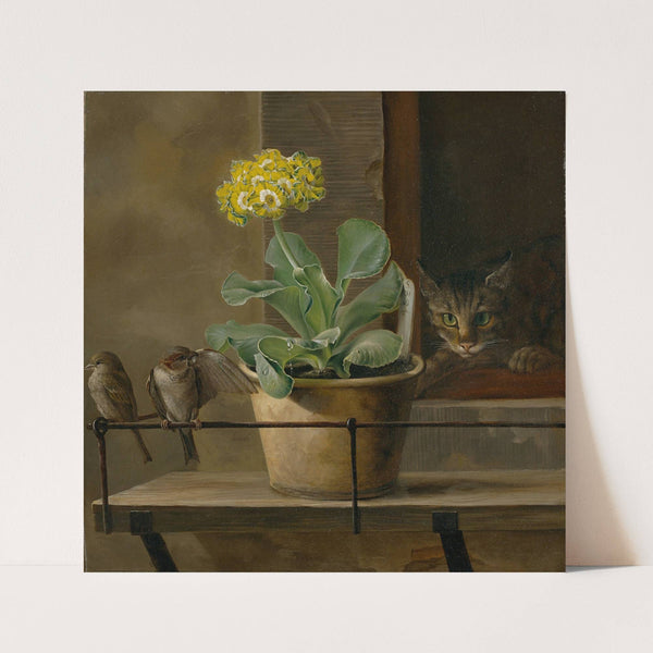 Still life with a primrose in a flowerpot, a cat and two sparrows by Martinus Rørbye - Wall Art Print