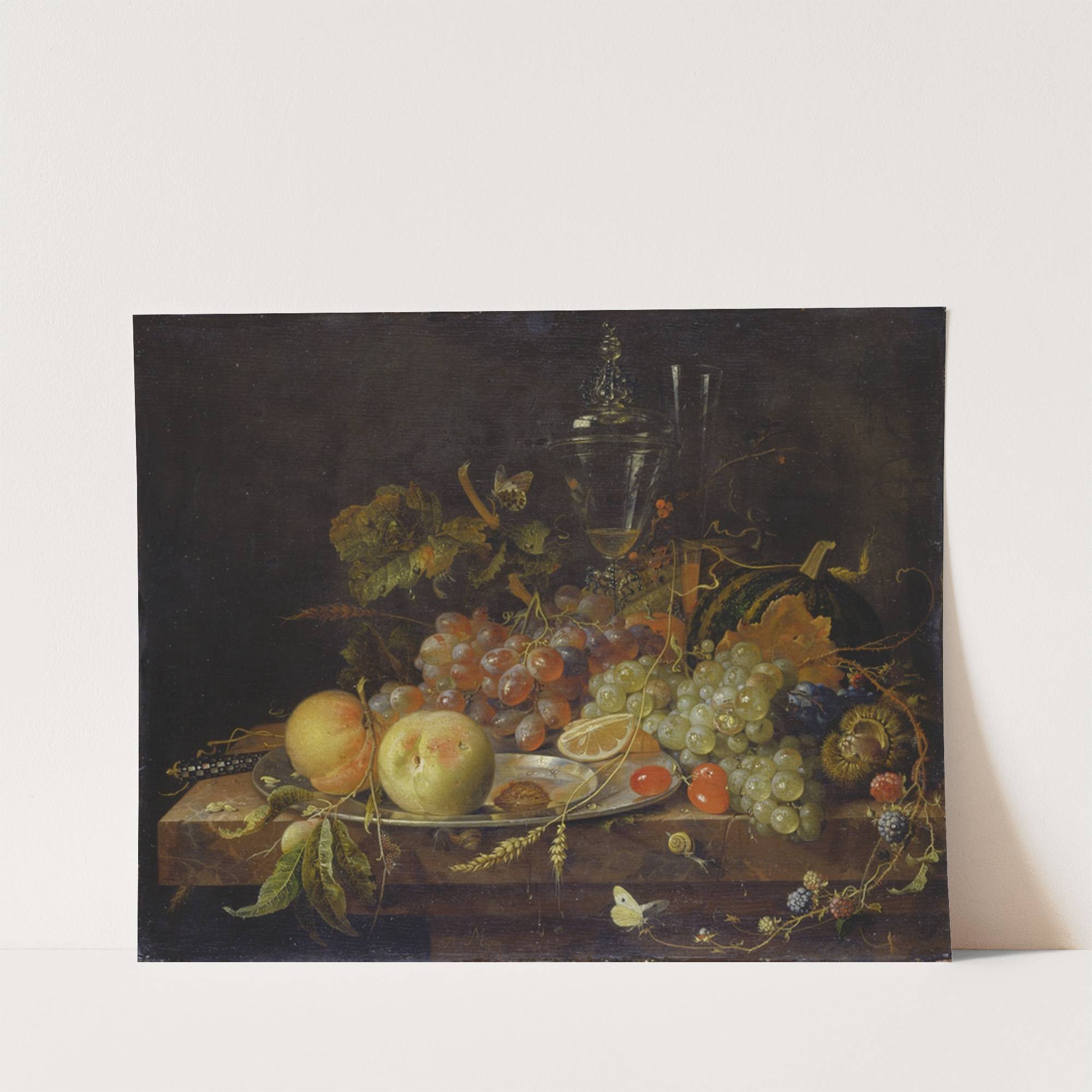 Introducing "Still Life with Fruit, Tin Plate, and Wine Glasses" by the renowned artist Abraham Mignon. This exquisite oil painting showcases an intricate still life arrangement with exceptional realism and detail. The centerpiece of the composition features a rich assortment...