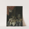 This stunning piece is "Sumptuous Still Life" by Abraham van Beijeren, showcasing an exquisite Baroque-style still life painting that exudes opulence and meticulous detail. The composition features a rich array of fruits, including pink peaches, white melons, and green apples,...